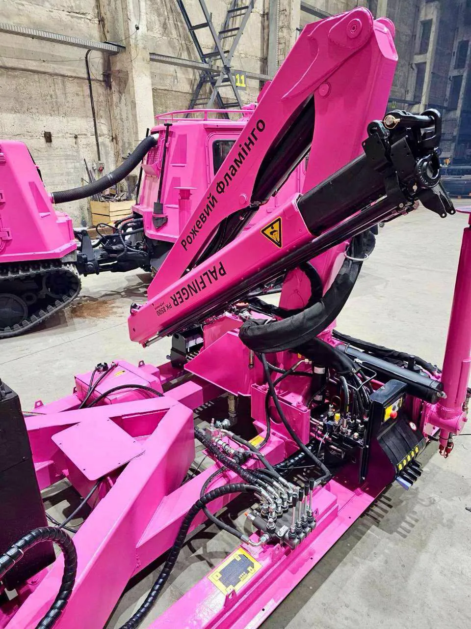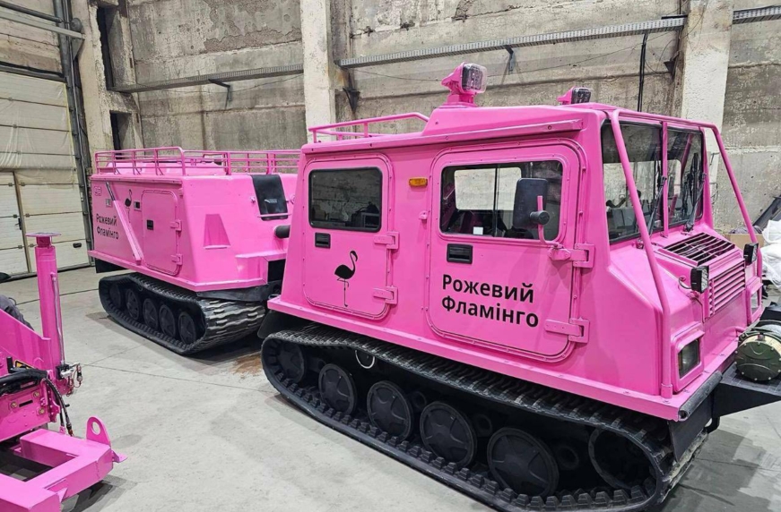 Що ж являє собою «Рожевий фламінго»? Як видно з фото, це гусеничний двосекційний всюдихід Bandvagn 206 від шведського виробника Haegglunds. Такі почали випускатися ще 1980 року і здобули чималу популярність, у тому числі й у військових – є такі й в ЗСУ