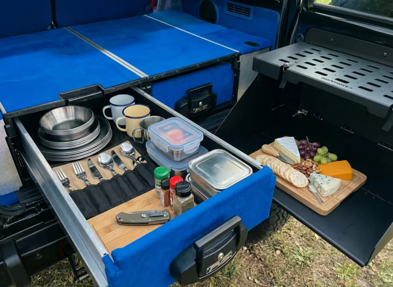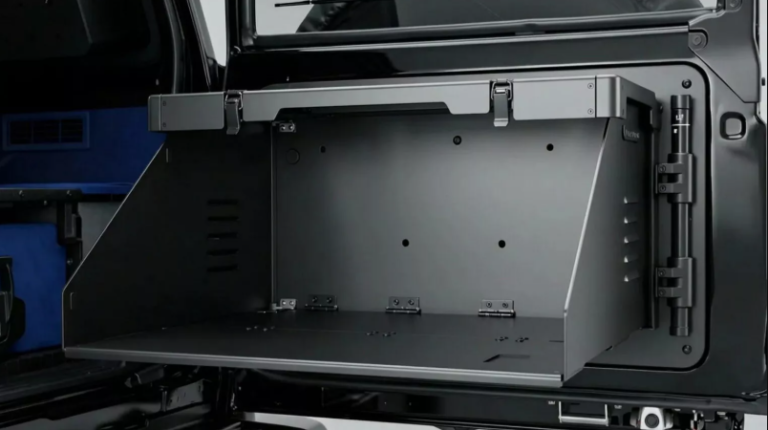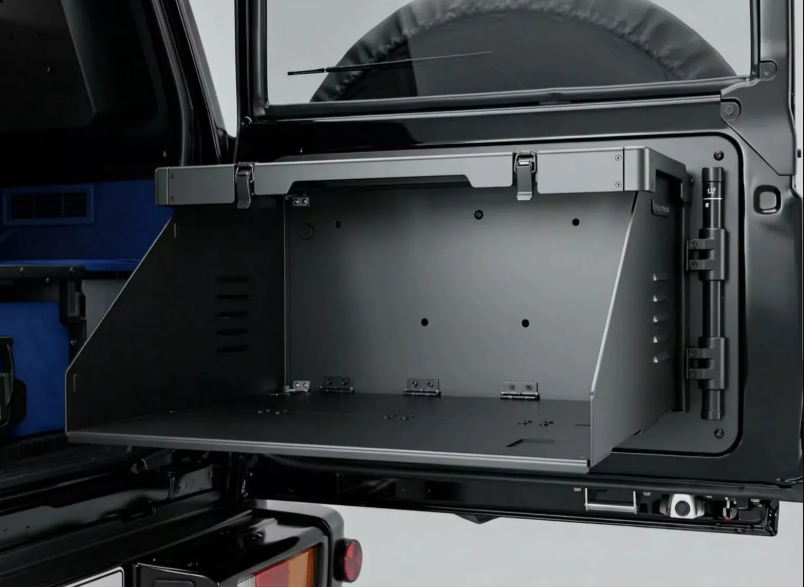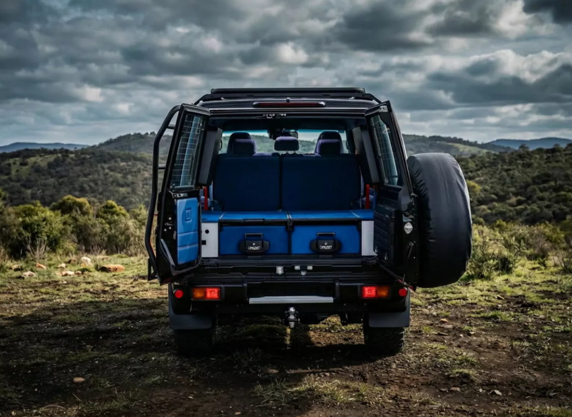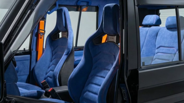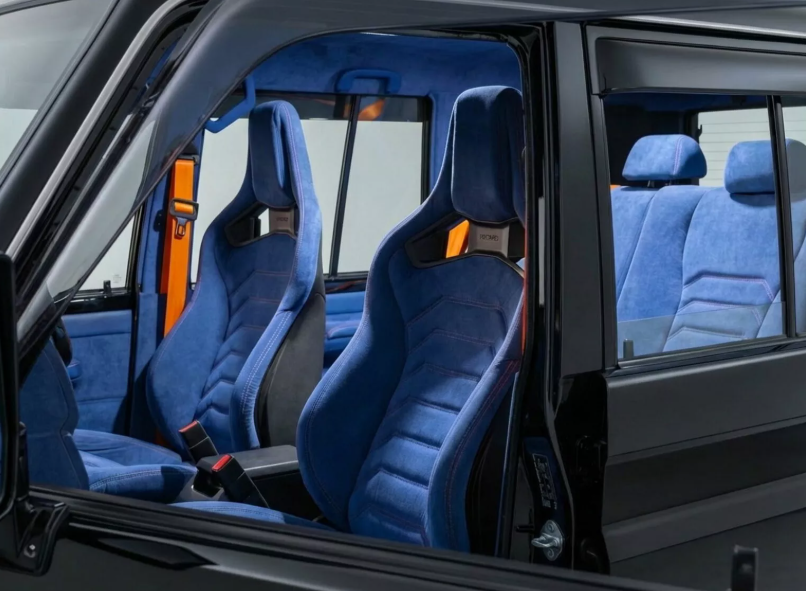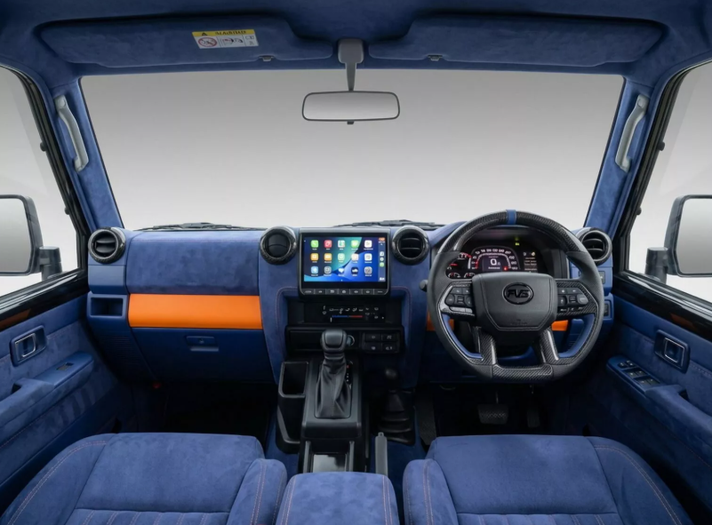 Обробку виконали синьою алькантарою, яку доповнює помаранчева контрастна строчка. В оснащення включили 9-дюймовий екран мультимед.повід і систему висувних ящиків в багажнику. На задній двері у позашляховика закріплений відкидний столик. Силової установки зміни не торкнулися.
