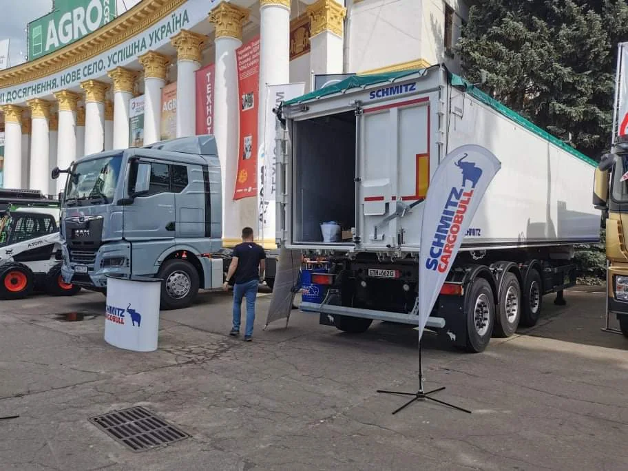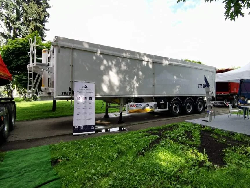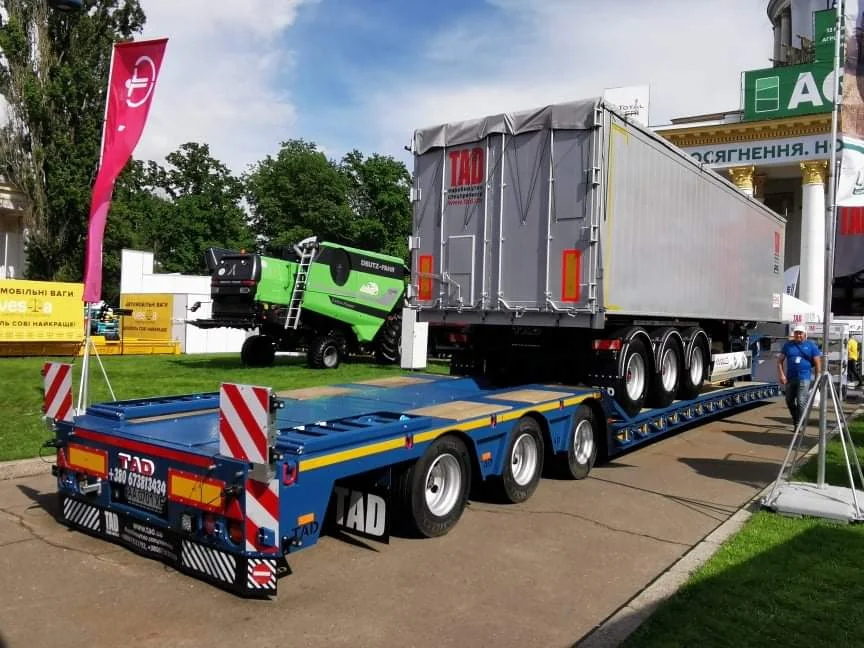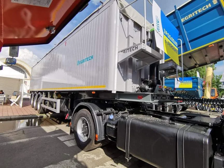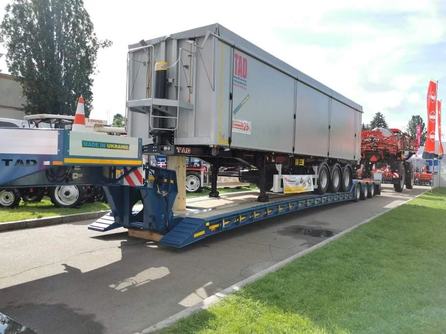 Также привез свой алюминиевый самосвальный полуприцеп-зерновоз и еще один украинский производитель – компания TAD. Он имеет полезный объем кузова 55 м куб., снаряженную массу 6,9 т и грузоподъемность 25 т. Гидравлика применяется марки Hyva.