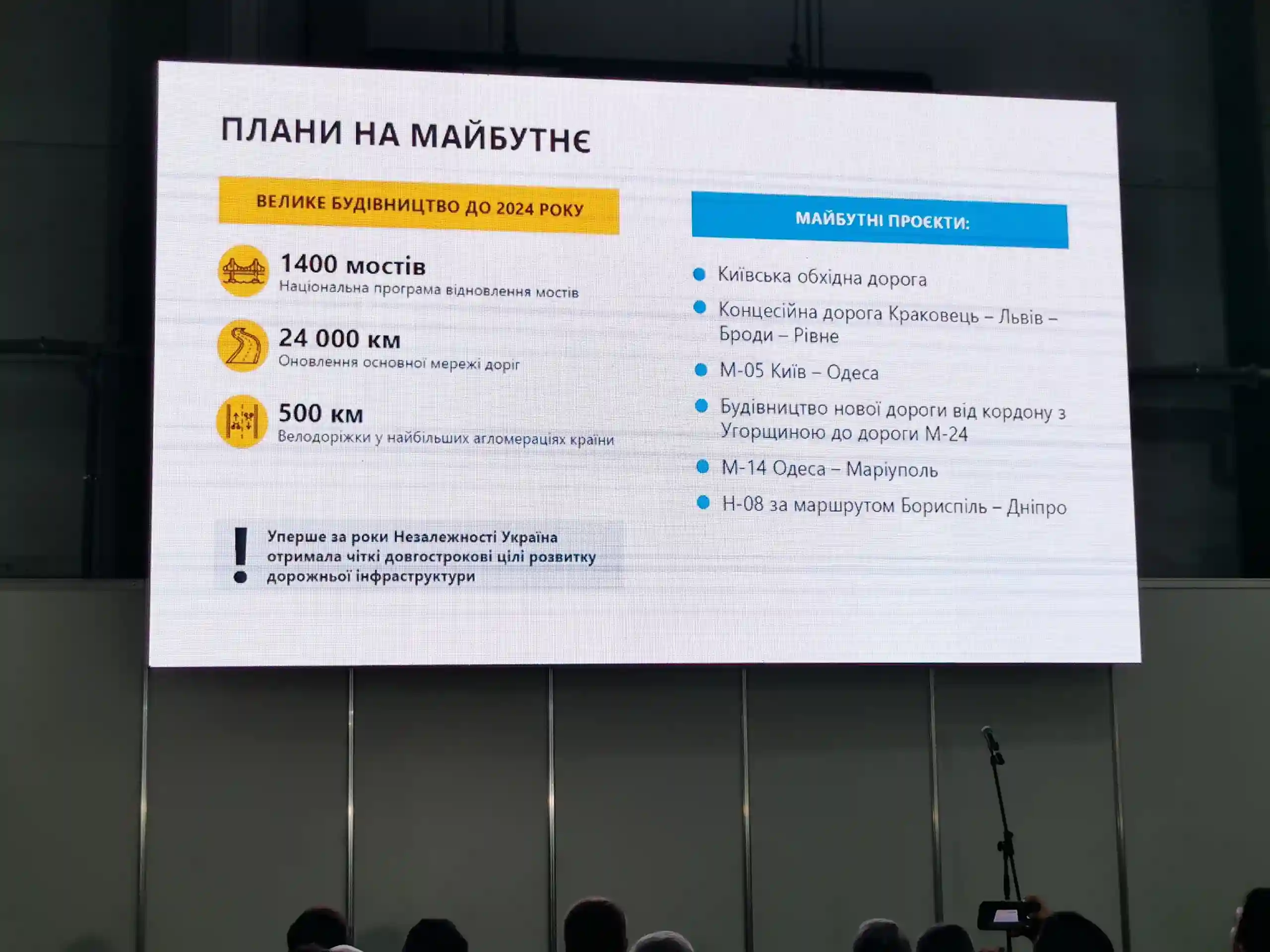 Из будущих проектов отметим: Киевскую объездную дорогу, первую концессионную дорогу Краковец – Львов – Броды – Ровно, трассу М-05 Киев – Одесса, строительство новой дороги от границы с Венгрией к дороге М-24; трассы М-14 Одесса – Мариуполь, а также Н-08 по маршруту Борисполь – Днепр.