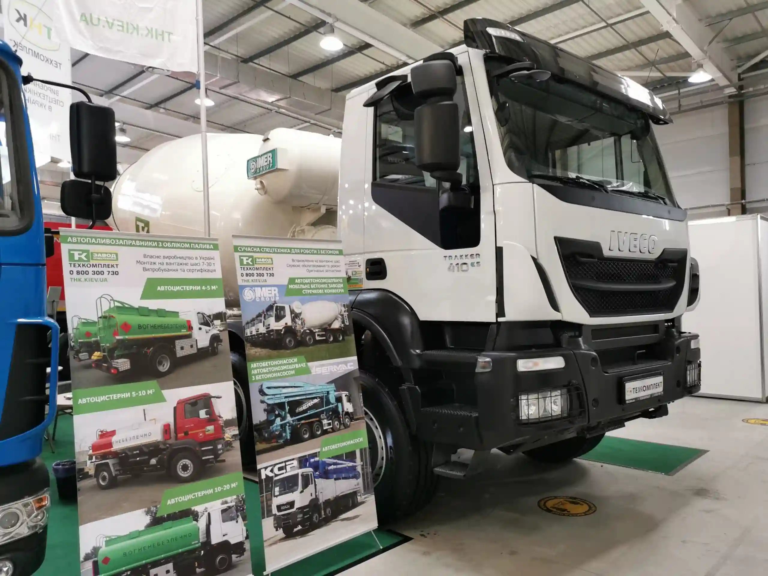Завод спецтехники «Техкомплект» привез на «Автодорэкспо» две интересных машины. Это автобетоносмеситель IMER на шасси IVECO Trakker AD410T41B (8х4). Барабан рассчитан на 10 кубометров бетонной смеси.