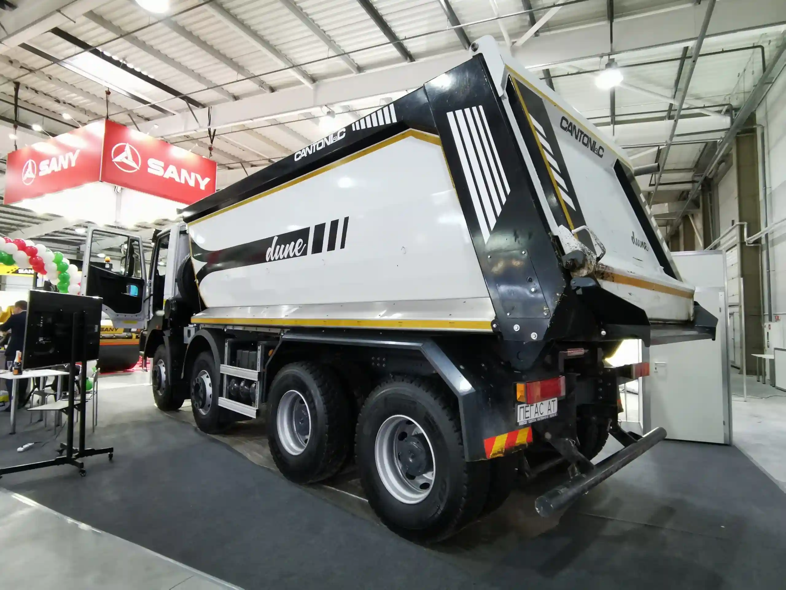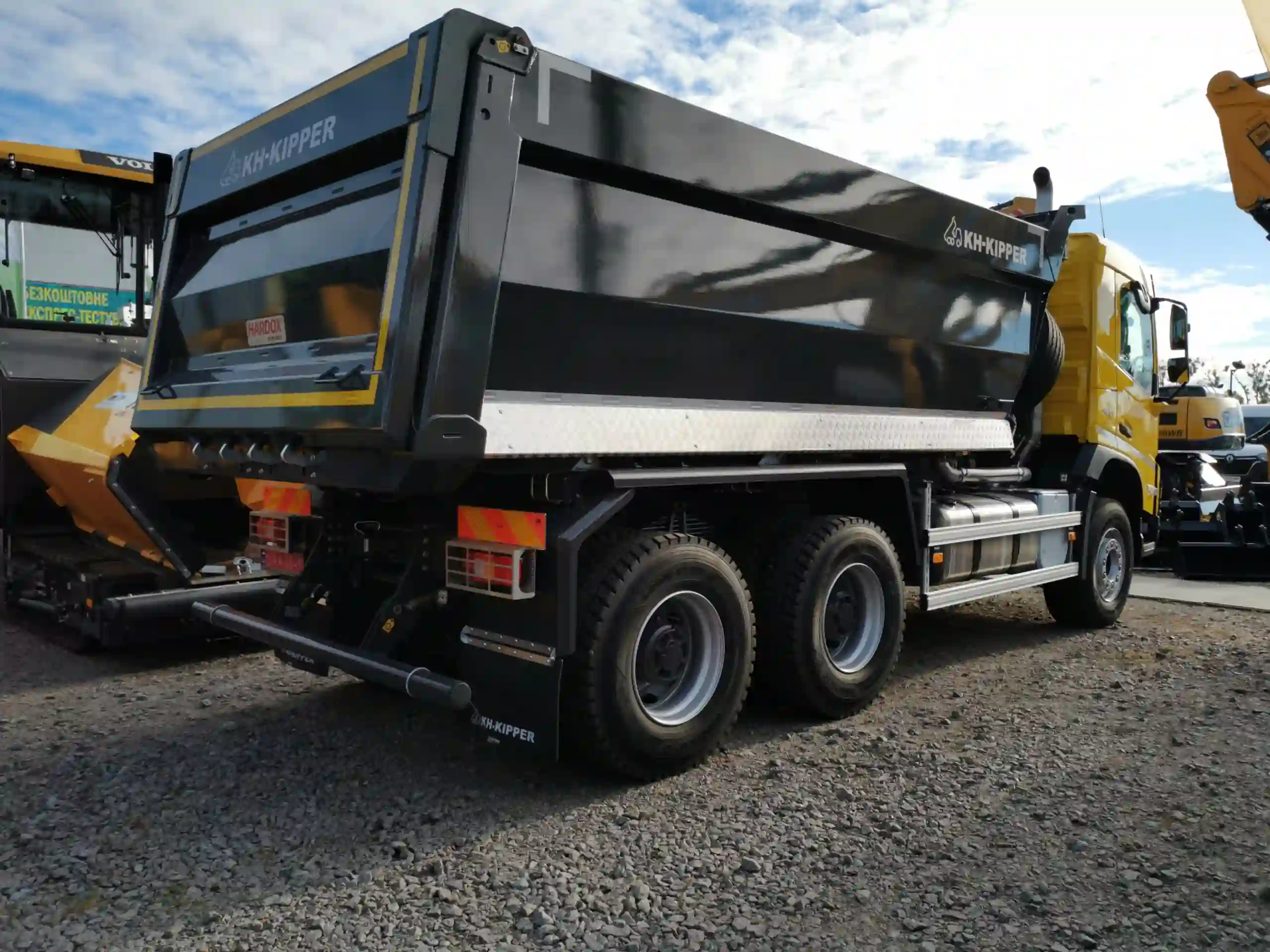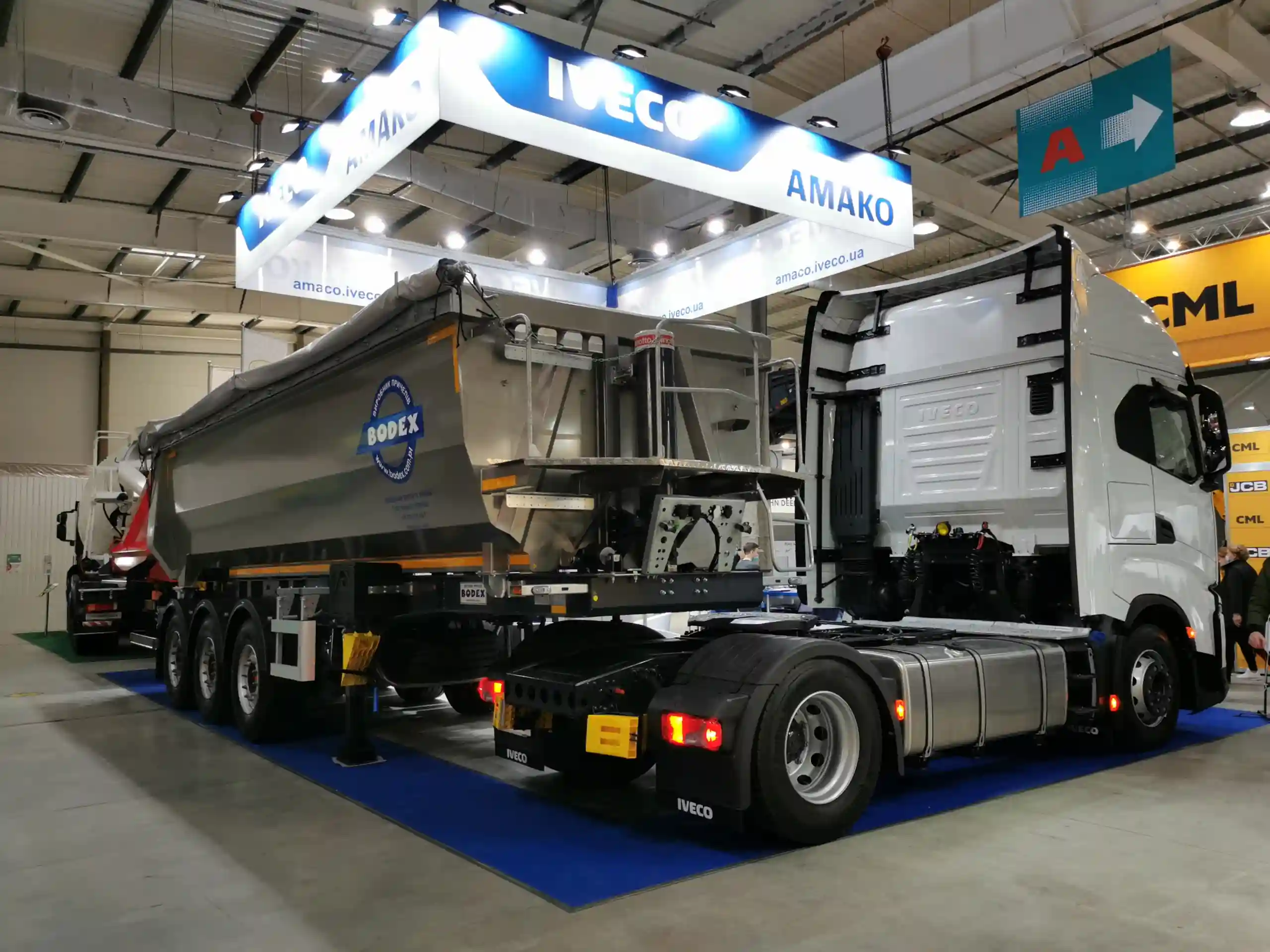 Тягач состыкован с самосвальным полуприцепом марки Bodex, кузов которого сделан по эксклюзивной, одношовной технологии, из двух соединенных вместе листов металла Hardox 450. На выставке показана самая популярная модель – объемом 27 м куб.