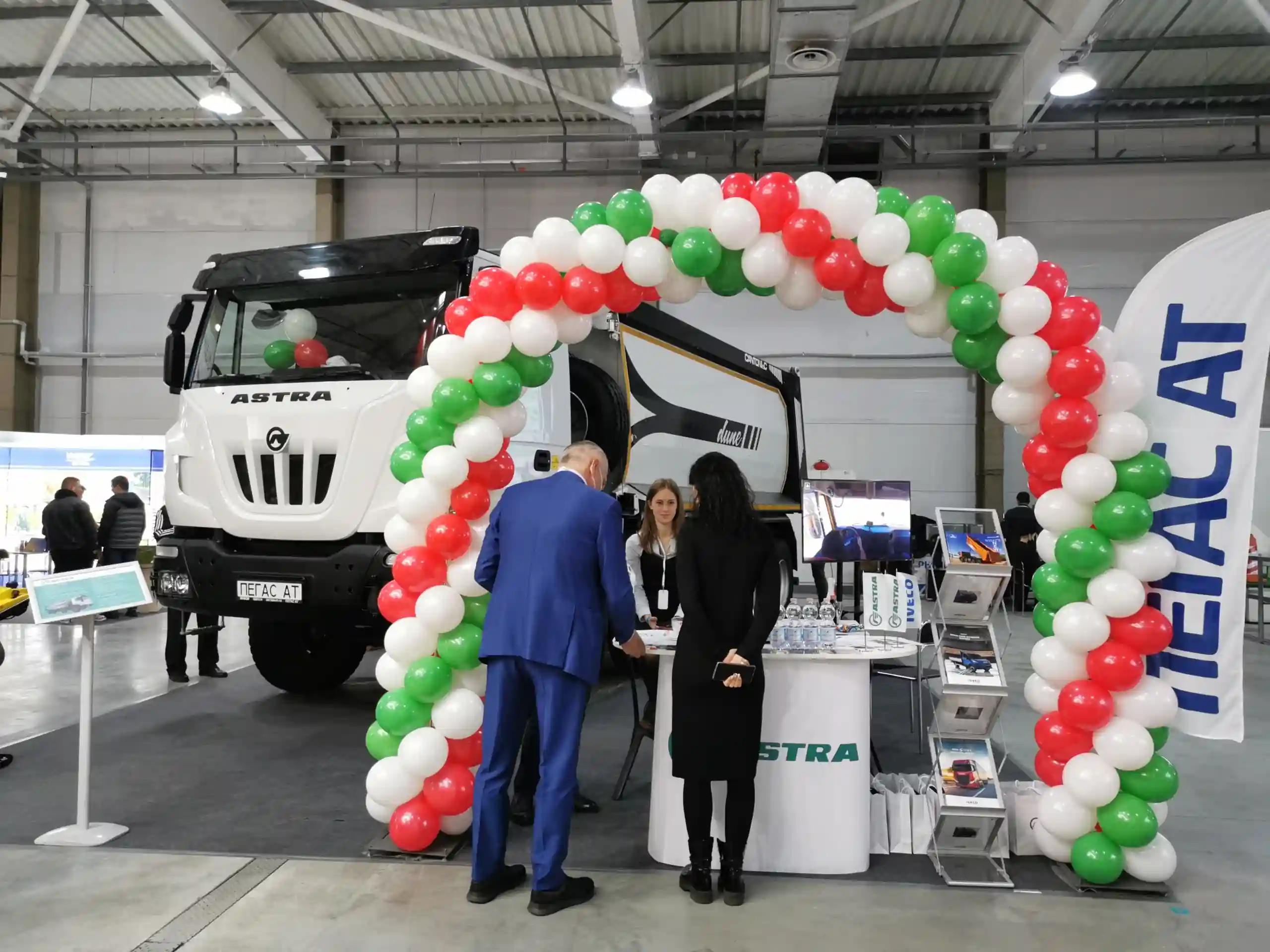 А на стенде «Пегас Автотрейд» можно увидеть интересный самосвал марки Astra – модель HD9 84 41 колесной формулы 8х4. Полная масса автомобиля достигает 50 т. Техническая нагрузка передних мостов – 9 + 9 т, а задней тележки – 32 т.