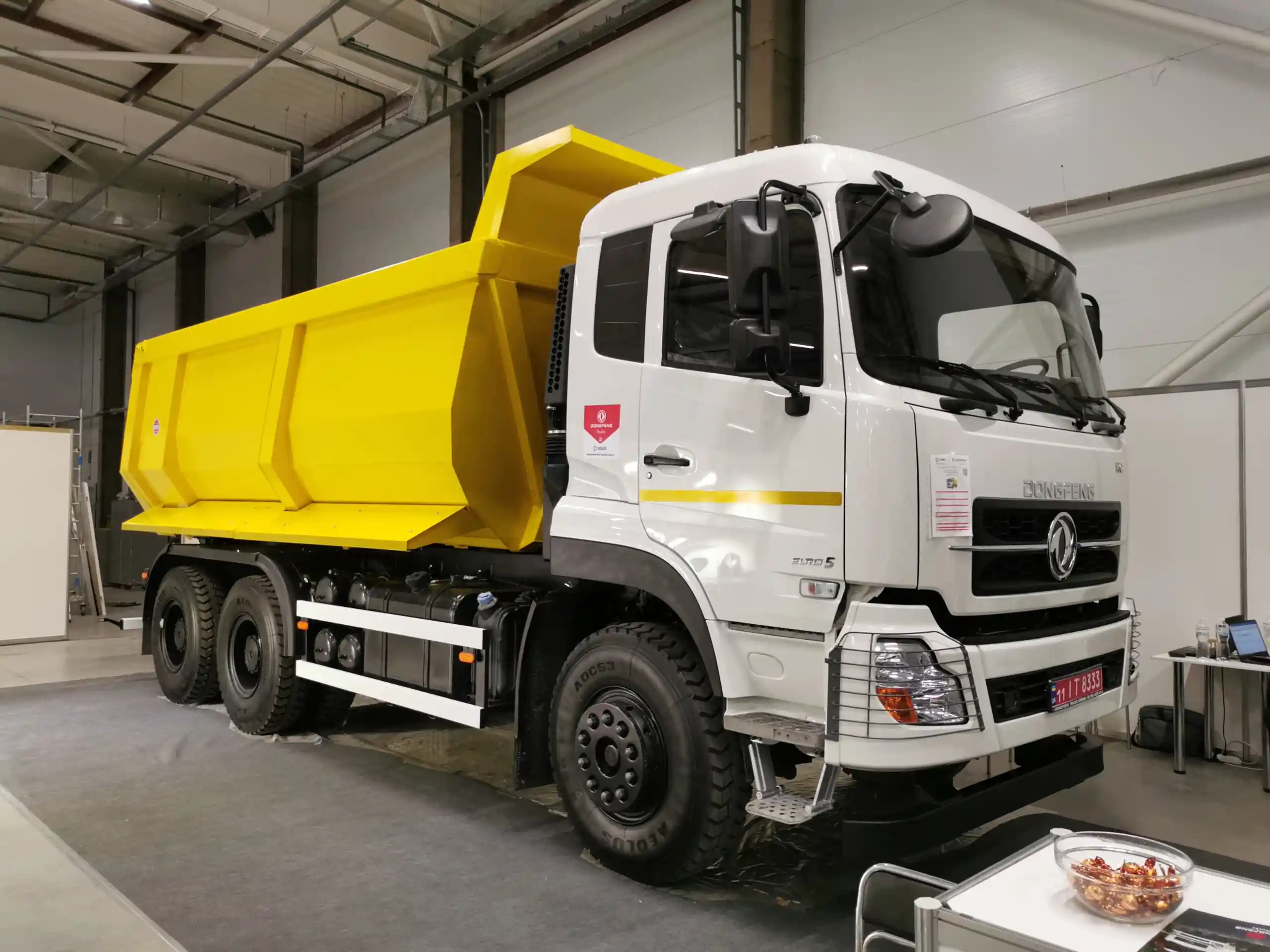 И наконец самым большим из представленного на выставке семейства Dongfeng является самосвал DFH 3330 A80 c полукруглым кузовом на 18 м куб. Последний имеет пол толщиной 8 мм и боковые стенки 6 мм. Снаряженная масса – 15 000 кг. Грузоподъемность – 20 000 кг. Машина оснащена 8,9-литровым турбодизелем Cummins в 340 л. с. (1482 Нм при 1400 об/мин) и механической, 12-ступенчатой КП FAST. Стоимость такого самосвала – 88 тыс. долларов.