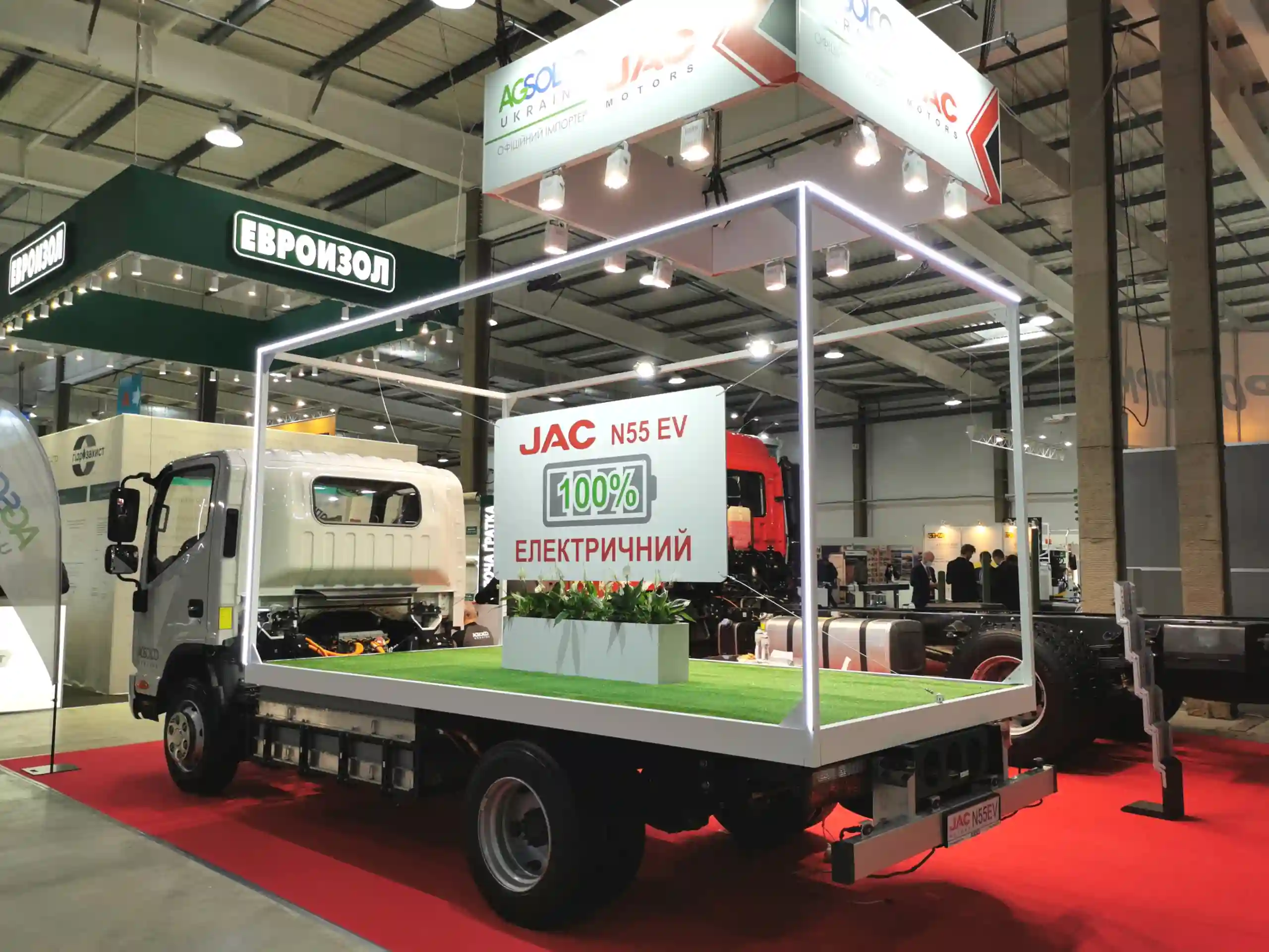 Компания «Агсолко Украина» представила на «Автодорэкспо» сразу несколько мировых премьер. Начнем с электрического грузовика JAC N55 – полной массой 5500 кг и грузоподъемностью шасси 2150 кг.