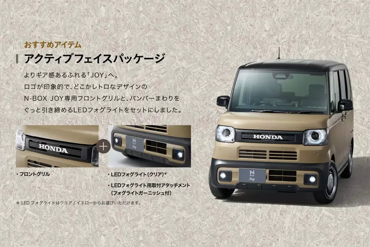 N-Box Joy створено на основі третього покоління популярної моделі кей-кар Honda, представленого минулого року. Від інших представників сімейства новинка відрізняється іншими бамперами, чорним облицюванням радіатора з написом Honda, колесам у стилі ретро та рядом інших відмінностей. Екстер'єр можна оживити за допомогою додаткових аксесуарів, багажника на даху, заднього спойлера та декоративних аплікацій.