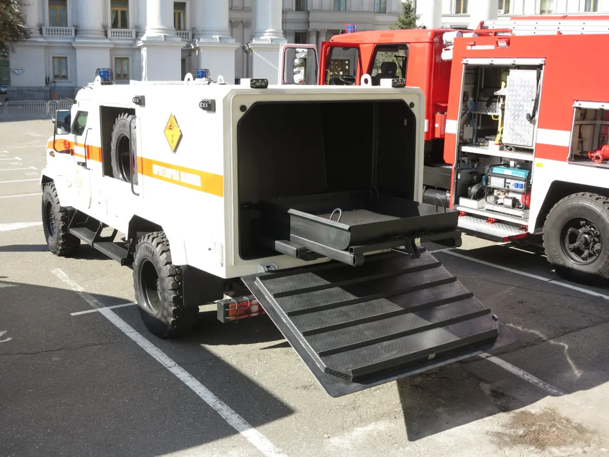 В задней части находится гидравлический подъемник с несколькими вариантами наклона и подъема. Управление подъемником осуществляется при помощи дистанционного пульта. В заднем отсеке на стенах предусмотрены направляющие, на которые крепятся съемные выдвижные консоли с фиксаторами для носилок. Время полного подъема носилок с земли на место для транспортировки 25 секунд. На потолке предусмотрены направляющие с креплениями для капельниц, LED-освещение и вентиляционные люки.