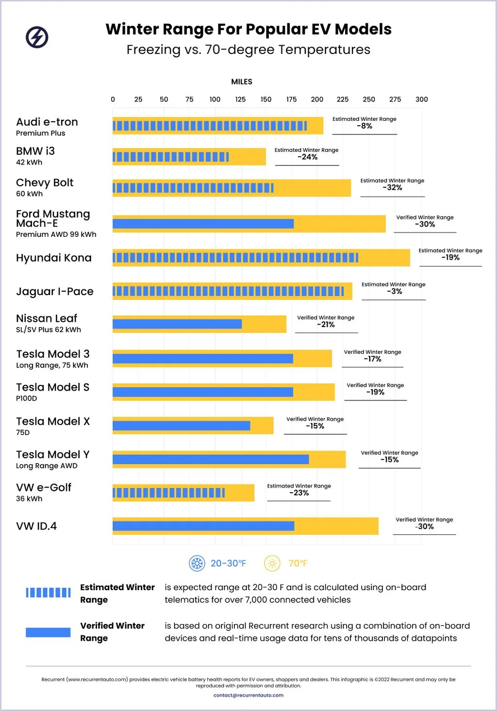 Аналітична компанія Recurrent провела дослідження, у рамках якого проаналізували дані 7000 електрокарів і з'ясувала, які з них у морозну погоду втрачають більше розрахункового діапазону. Для цього експерти протестували машини за температури +21 і -7 градусів за Цельсієм, а потім зіставили дані.
