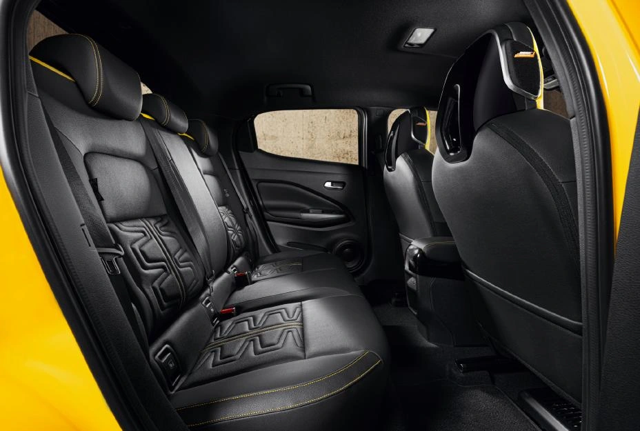 Продовженням цієї привабливої теми є сидіння N-Sport з жовтими вставками з Alcantara® в тон нового кольору кузова, які вкривають верхню зовнішню частину сидіння та переходять в центр сидіння біля бічних валиків. Оббивку сидіння та спинки простьобано з характерним візерунком, з тисненням «Juke» на рівні плечей на спинці сидіння. Завершує сміливий образ жовта прострочка.