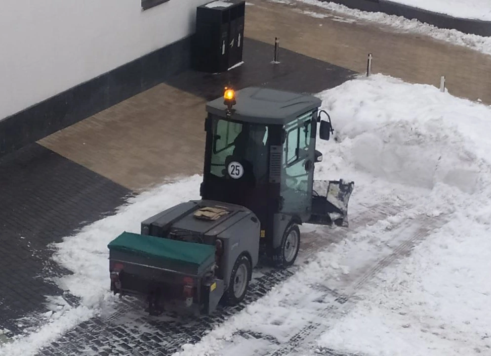 Спереду встановили снігоприбиральний відвал, а ззаду – ящик для посипання солі. А ось 1000-літровий бункер, який використовується влітку для сміття, зняли, що надало машині вигляду такого-себе «пуголовка».