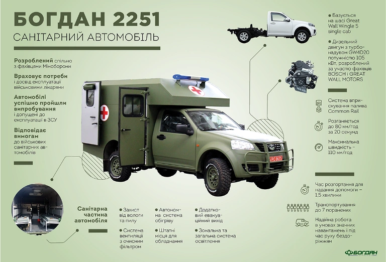 Напомним, что в основе «Богдан 2251» лежит шасси китайского внедорожника Great Wall Wingle 5. Автомобиль комплектуется турбодизелем GW4D20 мощностью 143 л. с. От 0 до 80 км/ч машина разгоняется за 20 с и достигает максимальной скорости в 110 км/ч. Специальная кузовная надстройка может вместить до семи раненных в положении сидя или троих – на носилках.