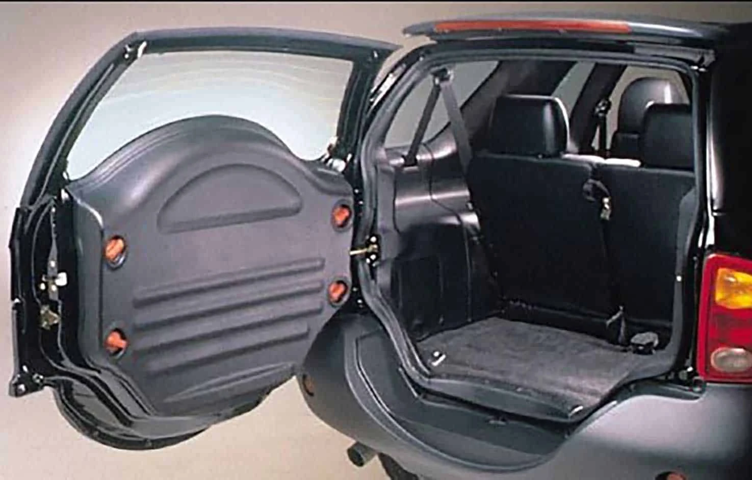 Облик автомобиля и впрямь удался – чего только стоят выпуклые надкрылки, образущие вместе с накладками на дверях и бамперами своебразный защитный пояс. А что касается кормы, то здесь главной фишкой стала дверь с круглым отсеком под запасное колесо, которое монтировалось с внутренней стороны.