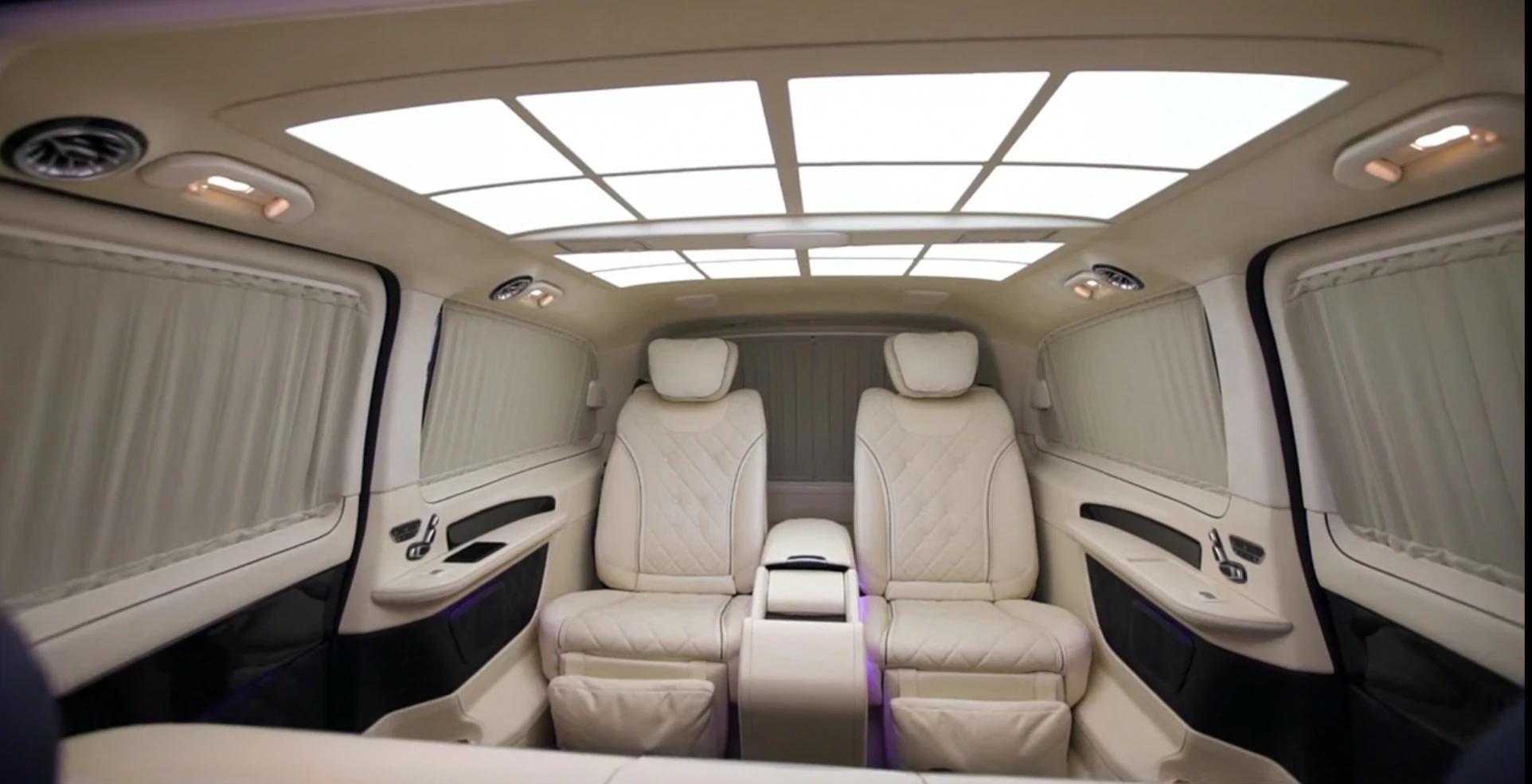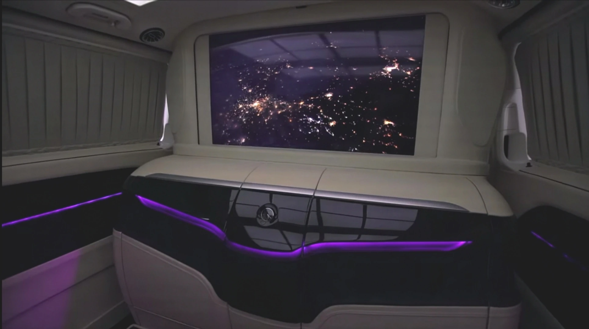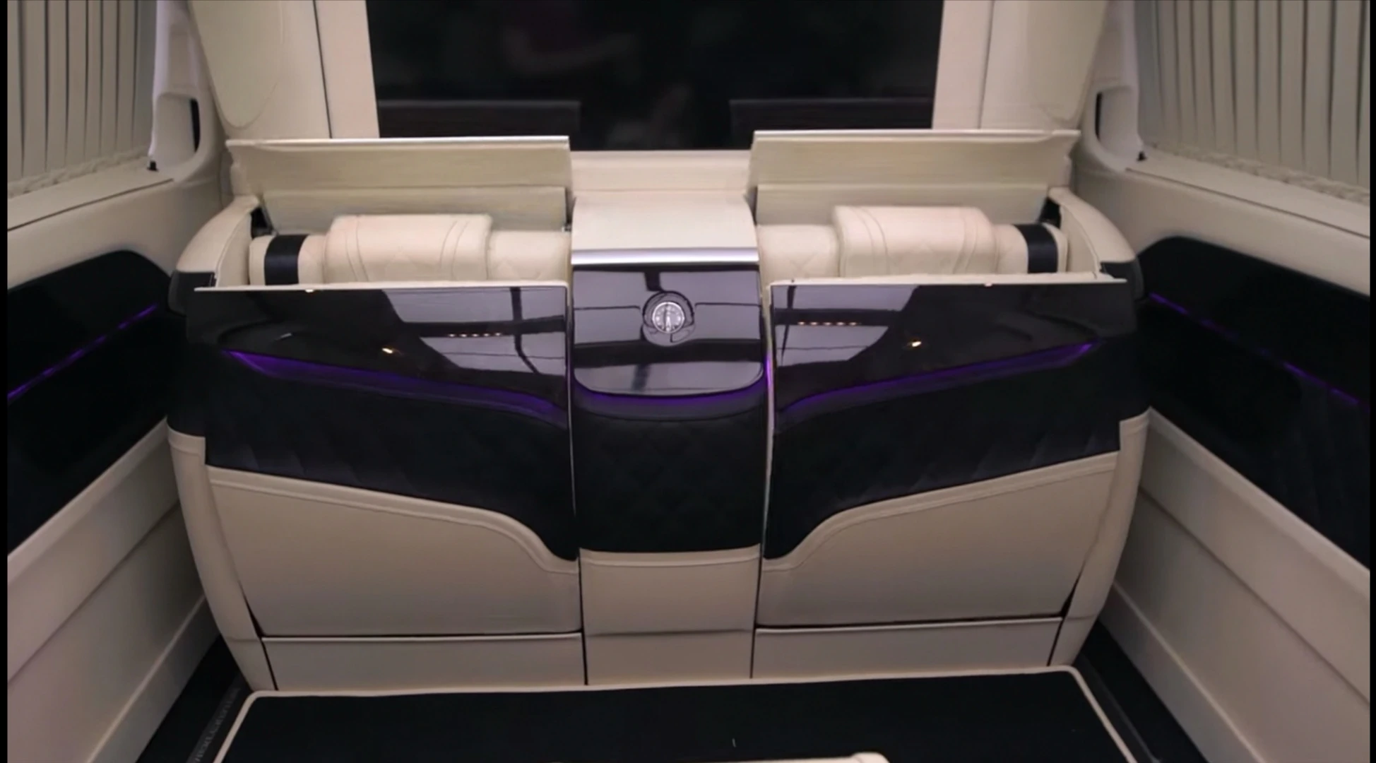 Поміж кріслами є консоль керування, за допомогою якої можна задіяти електропривід бічних зсувних дверей, підняти або опустити перегородку з величезним телевізором між салоном і кабіною водія, прибрати сидіння-трансформери, а також налаштувати клімат-контроль.