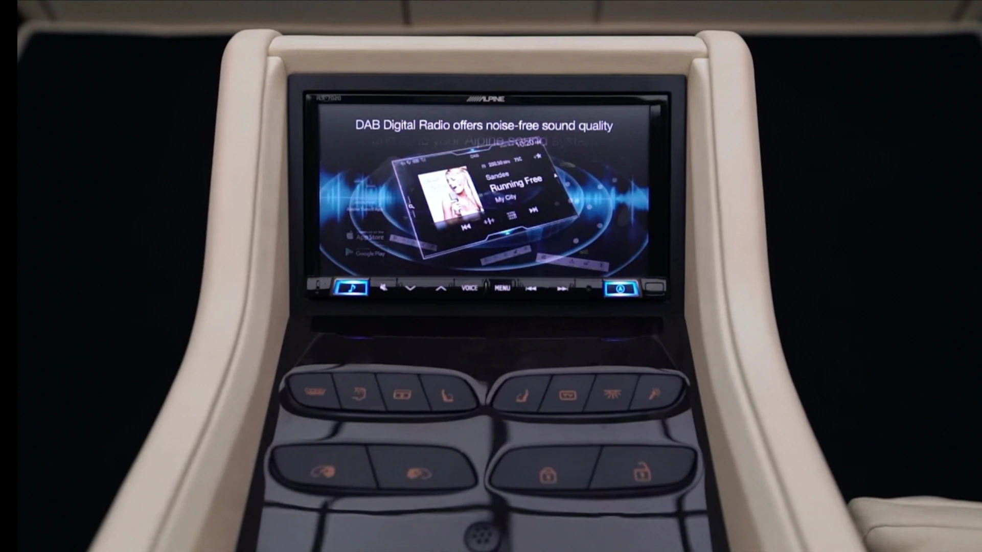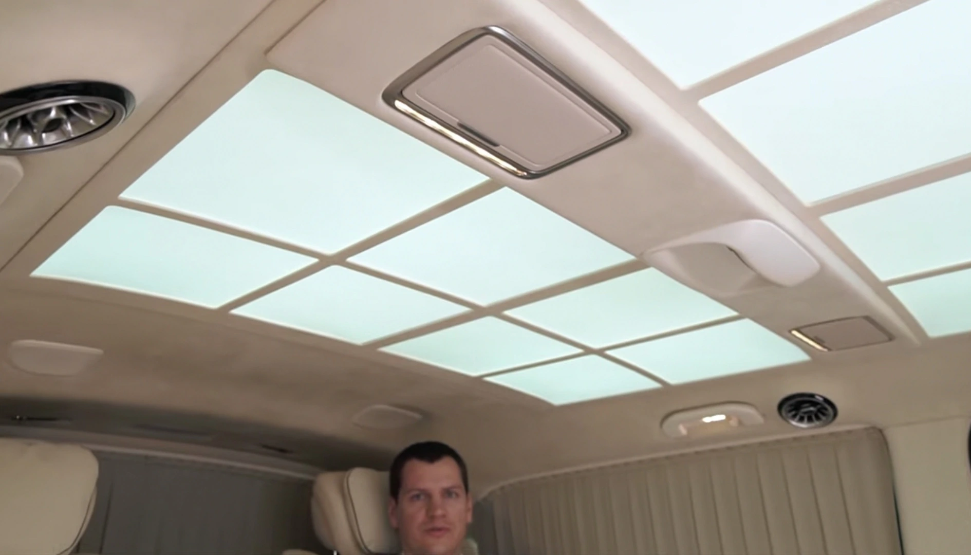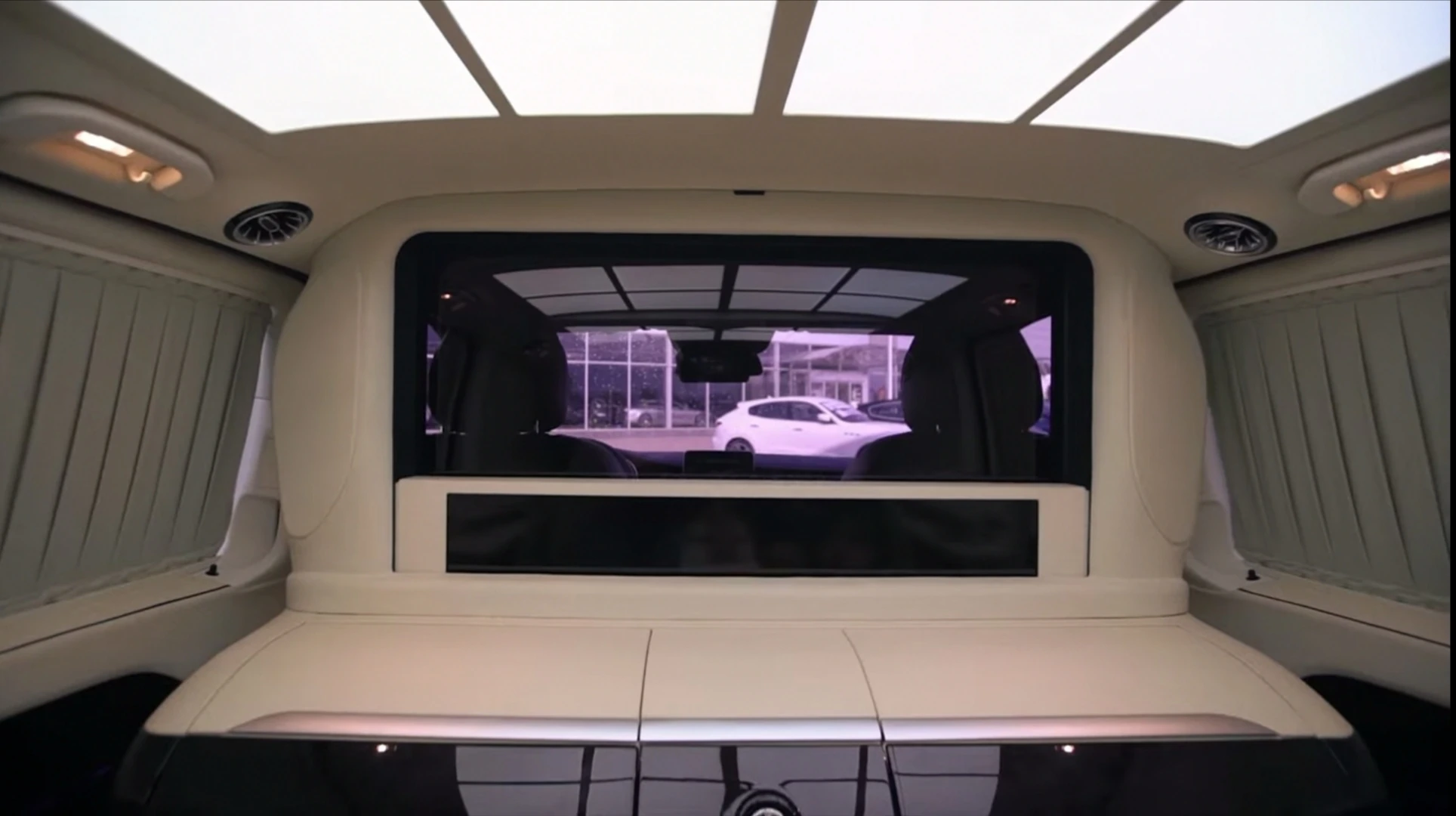 Поміж кріслами є консоль керування, за допомогою якої можна задіяти електропривід бічних зсувних дверей, підняти або опустити перегородку з величезним телевізором між салоном і кабіною водія, прибрати сидіння-трансформери, а також налаштувати клімат-контроль.