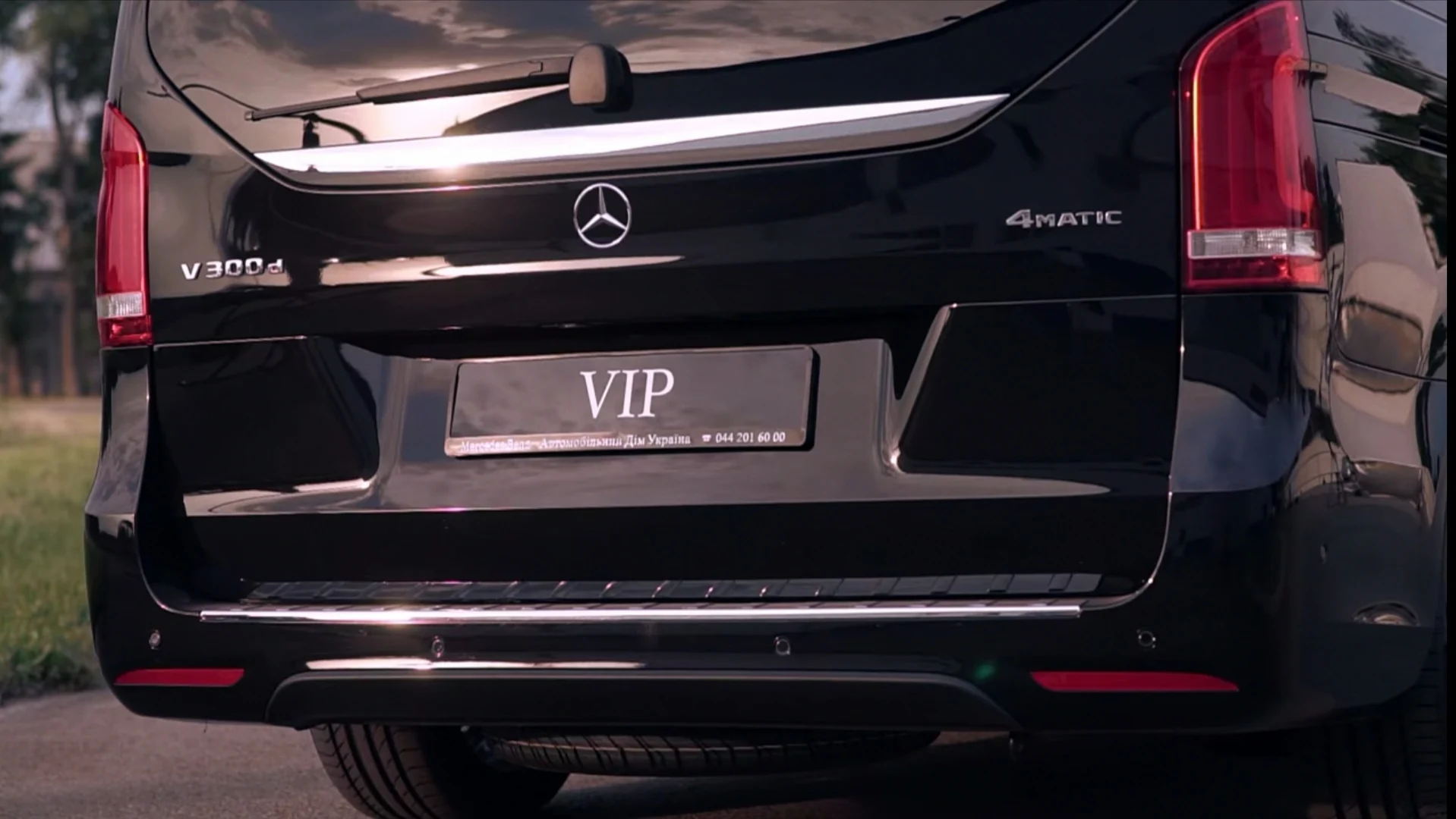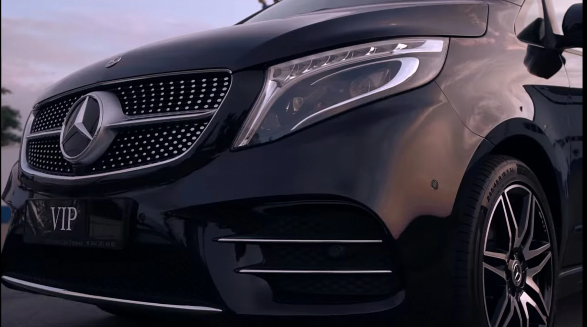 Довгобазний Mercedes-Benz V-Class VIP зовні відрізняється пакетом AMG c "діамантовою" решіткою радіатора і високоефектною оптикою Intelligent Light.