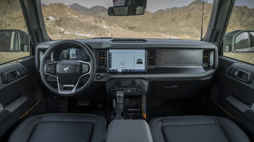 Європейський Ford Bronco стандартно укомплектований передніми сидіннями із підігрівом, аудіосистемою із 10 динаміками, мультимедійкою Sync4 із тачскрином діагоналлю 12 дюймів, системою кругового огляду та ADAS (удосконалена система допомоги водієві).