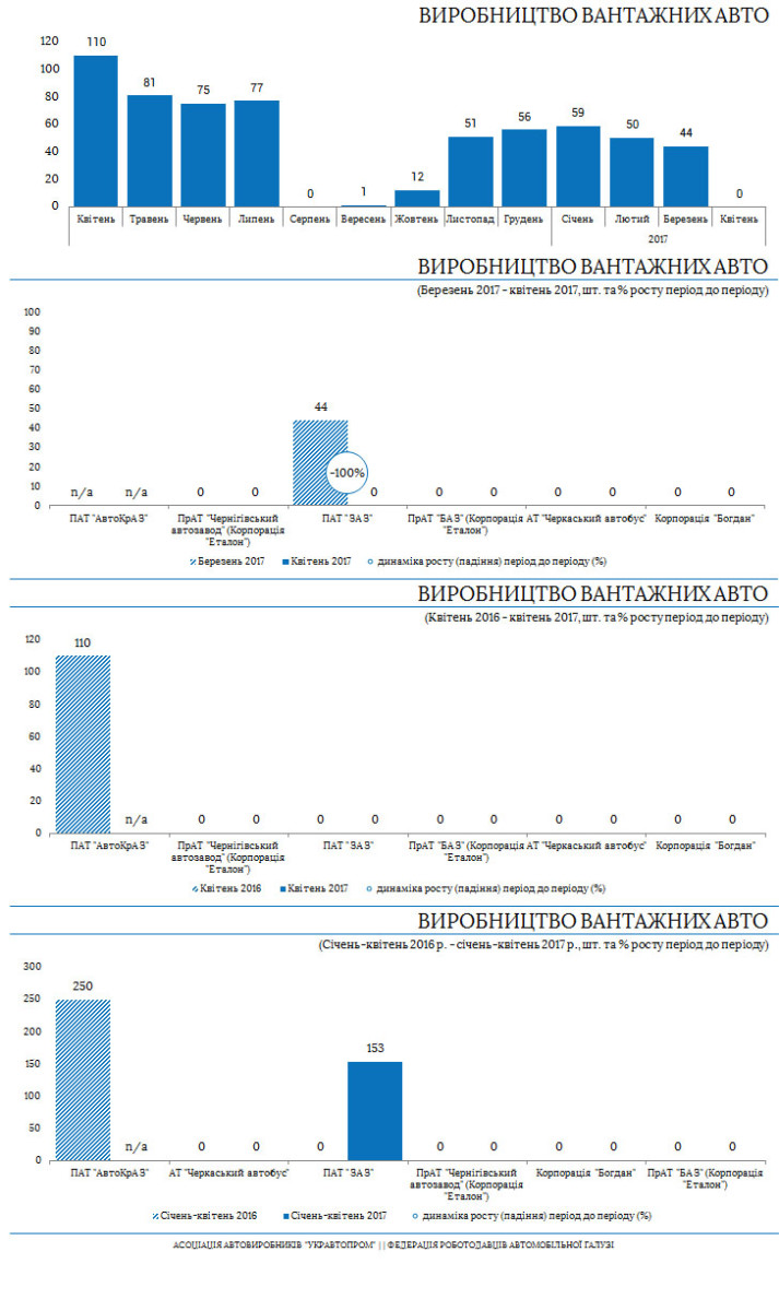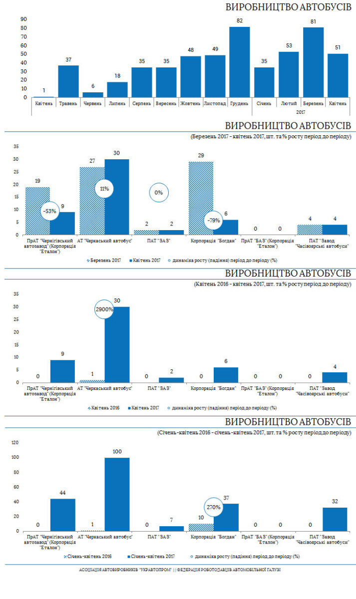 За квітень 2017 року вироблено 51 автобус (мінус 37% проти березня) різних виробників, а ось вантажівок не виробляли (АвтоКРАЗ не надає статистики).