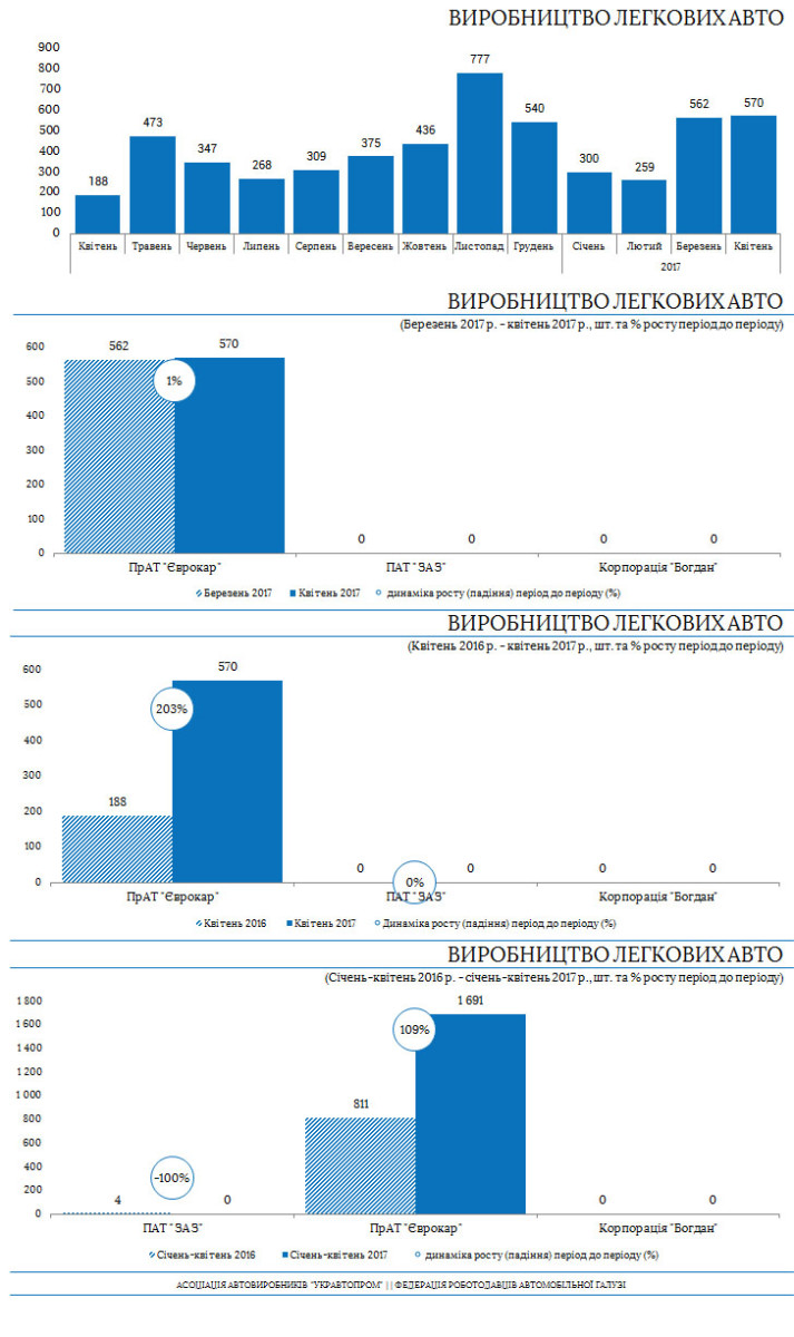 Загалом за 4 місяці 2017 року в Україні було складено 2064 автомобілі, що на 91,8% більше, ніж минулого року. З них легкових – 1691 шт. (+107,5% проти аналогічного періоду минулого року), вантажівок – 153 шт. (-38,8%), автобусів – 220 шт. (+1900% проти минулого періоду).