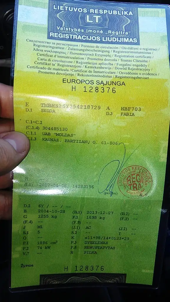 Ми сідаємо з продавцем у машину і починаємо неспішно розглядати документи. Зелений техпаспорт – як у всіх автомобілів на цьому базарчику – виданий в Литві, машина зареєстрована на фірму Moldas. Крім того, є страховка «Зелена карта», талон техогляду. А головне – довіреність виписана російською мовою, і вже не на 5, а на 10 років! Під цим екземпляром – та ж сторінка литовською. Зрозуміло, що графа, де треба вписати людину, якій довіряють – порожня. Але тут місце тільки під одну людину. Хоча продавець стверджує, що може виписати до чотирьох таких довіреностей на різних людей. На довіреності – печатка тієї самої фірми Moldas.