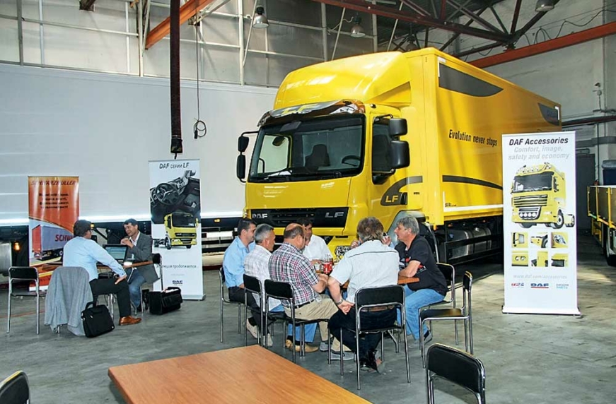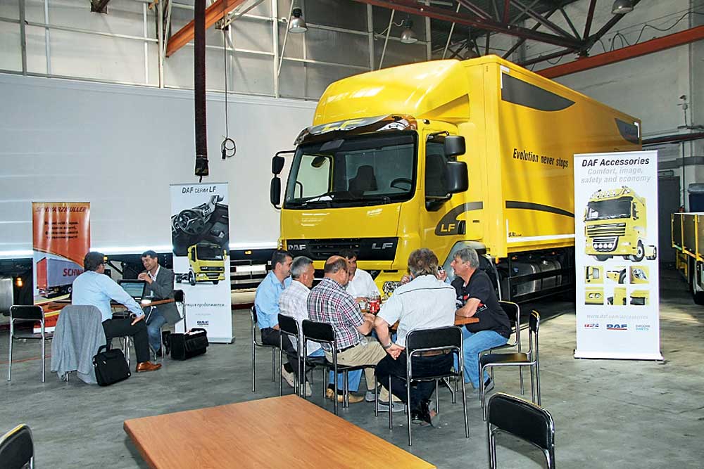 В этом году на дилер-шоу были показаны пять автомобилей: флагман марки XF105, седельник СF85, трехосный фургон СF85 и две развозные модели LF. Не обошлось и без прицепной техники. Так, тягач CF85 был с полуприцепом-цементовозом марки Kassbohrer, а седельный тягач XF105 – с самосвальным трейлером для сельхозгрузов от Schmitz Cargobull.