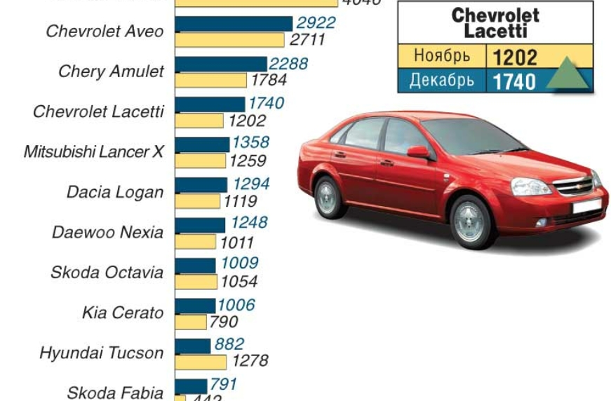 В завершающем месяце года основные игроки рынка немного изменили свои позиции. Главная сенсация декабря – Chevrolet впервые вырвался на второе место рейтинга украинского рынка, опередив Daewoo. Впрочем, такое развитие событий было предсказуемым. Ведь в Запорожье под брендом ZAZ теперь выпускается преемник «Сенса» – модель Lanos 1,4. Поэтому на марку Daewoo нынче «работают» лишь «Ланосы» с импортными двигателями и узбекские «Матизы» с «Нексиями». И хотя последние две модели за 2007 год заметно прибавили в продажах, до объемов «Сенса» в 2,5-3,2 тысячи машин в месяц им пока далеко. А тут еще Chevrolet Lacetti оказалось в салонах в достаточном количестве, и марка вышла на второе место. Кстати, если бы продажи ZAZ Lanos по сравнению с октябрем не выросли на 30%, то позиции автомобилей родом из стран СНГ в декабре ухудшились бы! В последнем месяце года «нашемарки», за исключением ЗАЗов, брали в том же количестве, что и в ноябре. Зато иномарки раскупались из салонов куда интенсивнее – их продажи по сравнению с предыдущим месяцем выросли на 8,6%. Особенно заметны успехи Chery Amulet, Chevrolet Lacetti, Skoda Fabia, Kia Cerato и Ford Fiesta. А вот Hyundai сдал свои позиции – в основном из-за нехватки на складах наиболее популярных моделей, в частности Tucson.