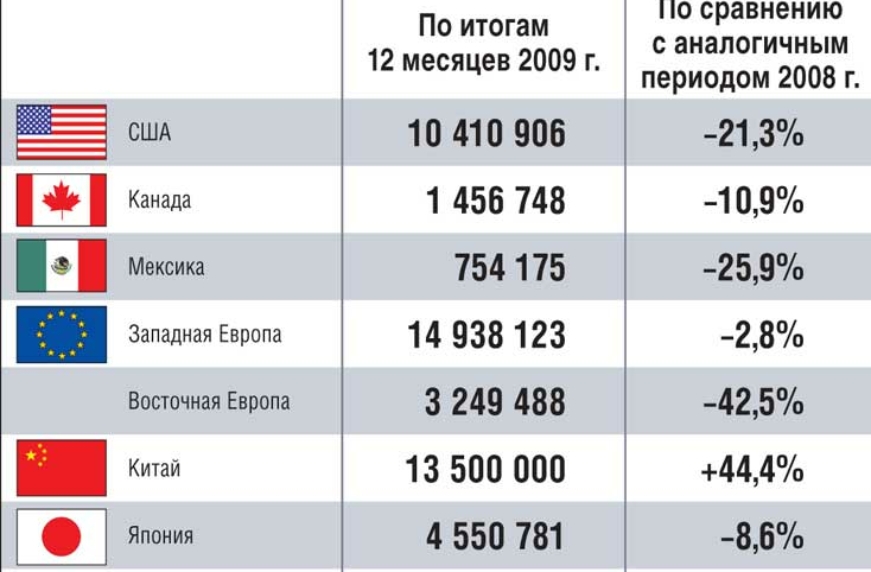Исключением из правил можно по праву назвать Китай. Этой стране не только удалось удержать продажи, но и утвердить себя в качестве нового лидера и стать рынком номер один в мире. В 2009 год в Поднебесной было реализовано свыше 13,5 млн. автомобилей (с учетом автобусов и коммерческой техники), что на 44% больше, чем в 2008-м. Таким образом, Китай остался единственным крупным рынком в мире, на котором продолжается рост автомобильных продаж. В стране, где уровень автомобилизации очень низкий (на тысячу жителей приходится 30 авто, тогда как в Германии – 545), компенсациями от государства поспешили воспользоваться сотни тысяч потенциальных автовладельцев. Как только правительство КНР пошло навстречу покупателям, на рынке было отмечено рекордное увеличение продаж. К примеру, в ноябре они выросли более чем на 92% (1,2 млн. авто) по сравнению с аналогичным периодом 2008 года.