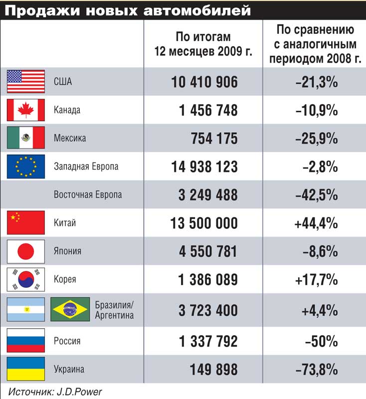 Объемы продаж на ключевых рынках Западной Европы еще больше «сожмутся». По прогнозам исследовательского агентства J.D. Power, в 2010 году в Старом Свете будет реализовано не более 12,19 млн. авто, что на 10% меньше, чем годом ранее. Довольно мрачными остаются перспективы и для рынков Восточной и Центральной Европы, в первую очередь для Румынии, стран Балтии, Польши, Венгрии, Словакии и Украины.