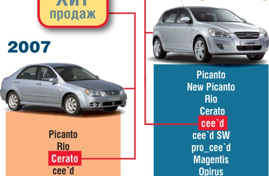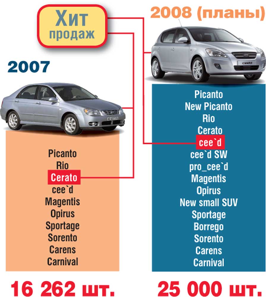 Базовый план продаж на текущий год – 25 тысяч автомобилей. Оптимистичные планы – реализовать 30–35 тысяч машин. Я уверен, что мы справимся с этими задачами, поскольку потенциал украинского рынка и, в частности, марки Kia достаточно высок. Сегодня наш рынок – второй по объемам продаж Kia в Восточной Европе и один из крупнейших в Старом Свете. Поэтому мы уверены, что Kia Motors обеспечит нас необходимым количеством автомобилей. Уже сейчас модельный ряд Kia один из самых больших среди конкурентов. В нынешнем году он пополнится 3-дверным хэтчбеком pro_cee`d, большим внедорожником Borrego и малым кроссовером. Кроме того, скоро ожидается новая версия Picanto, а в конце 2008 – начале 2009 года запланирован выпуск нового поколения популярной модели Cerato. Кстати, именно Cerato и модельная линейка cee`d составят наибольшую долю продаж автомобилей марки.