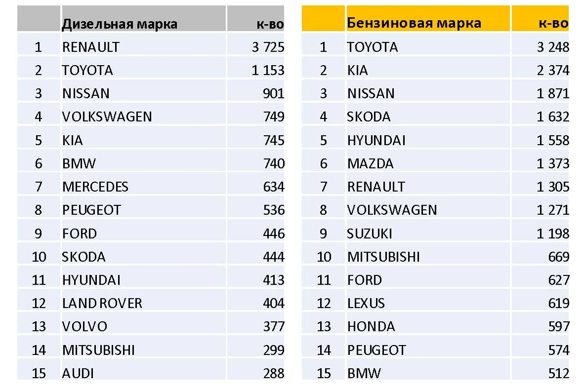Что касается предпочтений в определенных марках, то они тоже есть. Больше всего зарегистрировано дизельных Рено, в ТОП-5 также Тойота, Ниссан, Фольксваген и Киа.