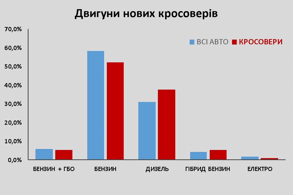 Сравнив данные прошлого и текущего года, можно увидеть, что дизельные моторы оттеснили не только бензиновые, а и суперсовременные гибриды (+1,7%) и электромобили (+0,7%). Но где еще остаются сильными позиции дизелей, так это у кроссоверов. Там они сохранили прошлогоднюю долю 37,5%.