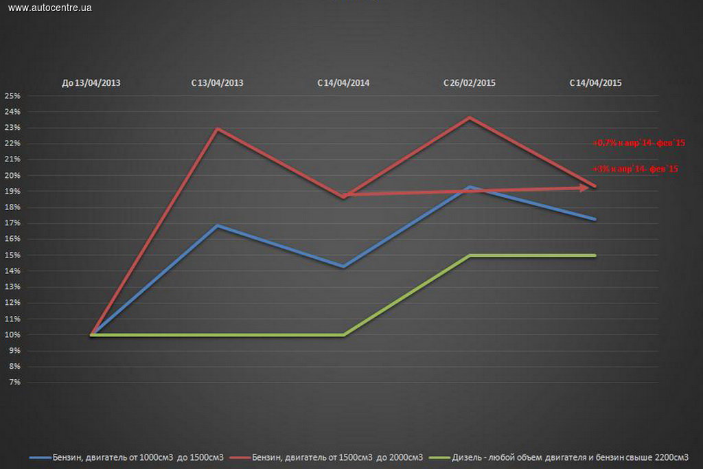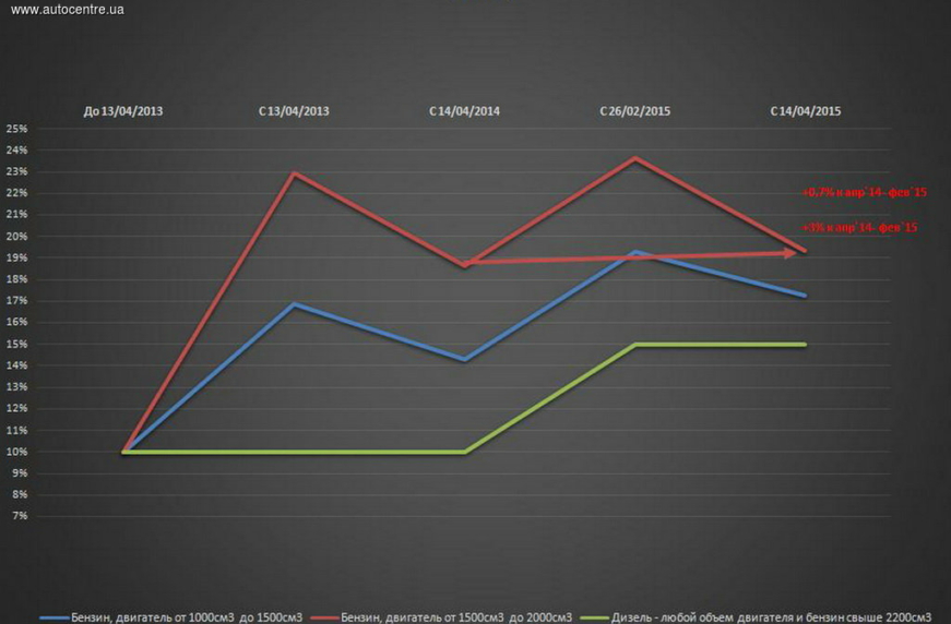 Кроме того, с 26 февраля был введен импортный сбор в размере 5% от стоимости промышленного товара, ввезенного в Украину. И этот сбор, действующий сейчас, перекрывает снижение спецпошлины. Так, если сравнить базу налогообложения импортируемых автомобилей на середину апреля 2015 с началом текущего года, то налоги на автомобили с мотором от 1,0 до 1,5 литра увеличились на 3%, с двигателем от 1,5 до 2,2 л – практически не изменились (+0,7%), а на дизельные машины выросли на размер импортного сбора – то есть 5%.