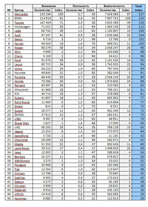 При составлении списка аналитики учитывали не только обсуждаемость автомобильного бренда, а также количество лайков, перепостов и упоминание в комментариях.