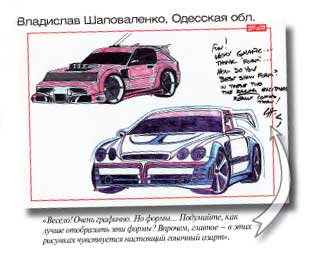 Оценивать такие рисунки – дело очень тонкое; ведь за каждым из них cтоит живой человек, для которого любое слово одобрения, равно как и критическое замечание, может стать решающим при выборе жизненного пути. Это не громкие слова – авторам большинства рисунков меньше двадцати лет, а значит, их жизнь и карьера только начинаются. Именно поэтому мы и не стали устраивать какиелибо конкурсы, а обратились за рецензиями к человеку, чей авторитет в области автомобильного дизайна не подвергается ни малейшим сомнениям.