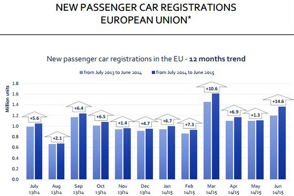 Согласно данным Ассоциации европейских автопроизводителей (ACEA), в июне авторынок Европы показал очередной рекорд. Такого всплеска продаж в ЕС не было с 2009 года. В абсолютных цифрах продажи составляют 1 364 009 машин, что на 14,6% больше, чем в июне прошлого года.