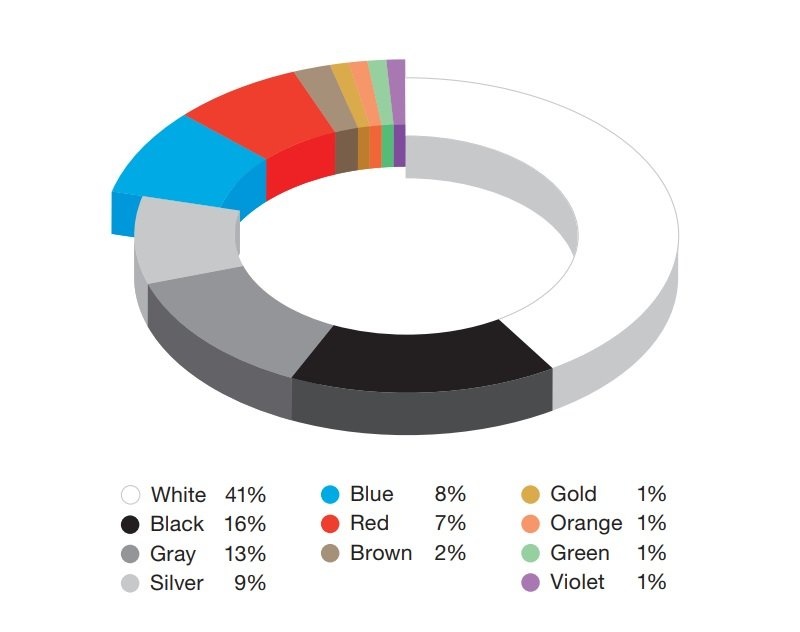 Згідно з даними, наданими фірмою BASF, за підсумками минулого року найпопулярнішим “автокольором”, як і раніше, з великим відривом залишається білий колір, в який забарвлені 41% нових авто. На другій позиції з відсотком 16% – чорний колір, а третє “призове” місце у сірого кольору (13%). Також до групи лідерів потрапили такі кольори: блакитний (8%), червоний (7%) і коричневий (2%). Усі інші варіанти не змогли подолати однопроцентний бар’єр.