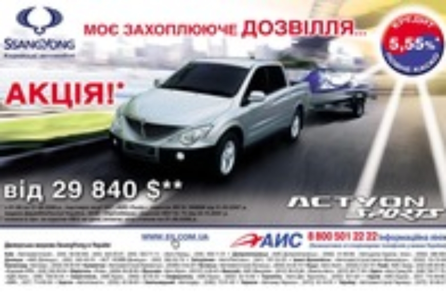 Компания «КМ-Украина» (корпорация «АИС»), эксклюзивный импортер автомобилей SsangYong в Украине, снизила цену на многофункциональный автомобиль SsangYong Actyon Sports в комплектации «Стандарт». Если раньше пикап стоил 30640 долларов США, то теперь его можно купить за 29840 долларов. Пикап SsangYong Actyon Sports –хорошее предложение для почитателей активного образа жизни. Поэтому SsangYong Actyon Sports востребован среди современных людей, которые держат руку «на пульсе» времени.