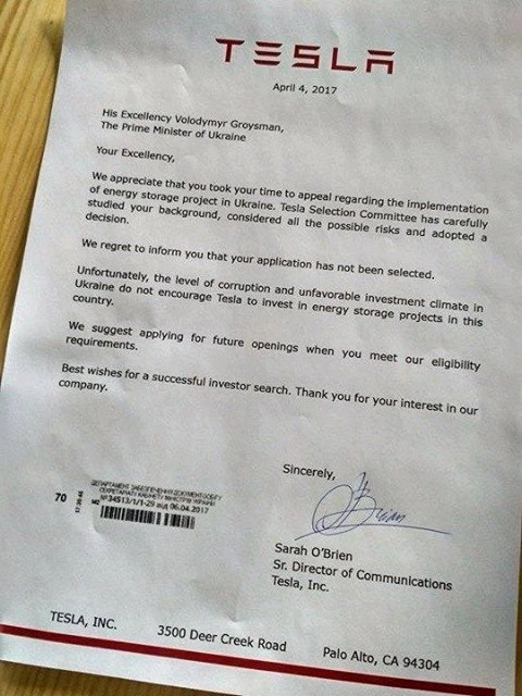 В интернете появилось письмо якобы от представителей Tesla, адресованное премьер-министру Владимиру Гройсману. В нем озвучен отказ от предложенного правительством Украины сотрудничества. Одним из первых письмо опубликовал директор специальных проектов научно-технического центра «Психея» Геннадий Рябцев.