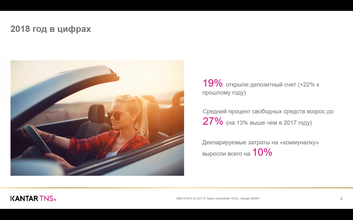 В ходе нашего большого анализа рынка и составления прогнозов мы обратились в компанию TNS в Украине, представляющую в нашей стране компанию TNS, лидера международных маркетинговых исследований. Не буду сейчас утомлять обилием графиков и цифр, приведу лишь некоторые.19% украинцев в 2018 году открыли депозитные счета. Это на 22% больше, чем в 2017 году. Еще раз – это важнейший показатель, подтверждающий: свободные средства в стране есть, это раз, и люди начинаю доверять банкам – это два. Средний процент свободных денег вырос на 27% - это на 13% выше, чем в предыдущем году. Тут многие начнут спорить, что люди жить лучше не стали, выросли затраты на коммуналку – так вот, декларируемые затраты на коммунальные услуги за 2018 год выросли на 10%. Печально, конечно, но не катастрофа.