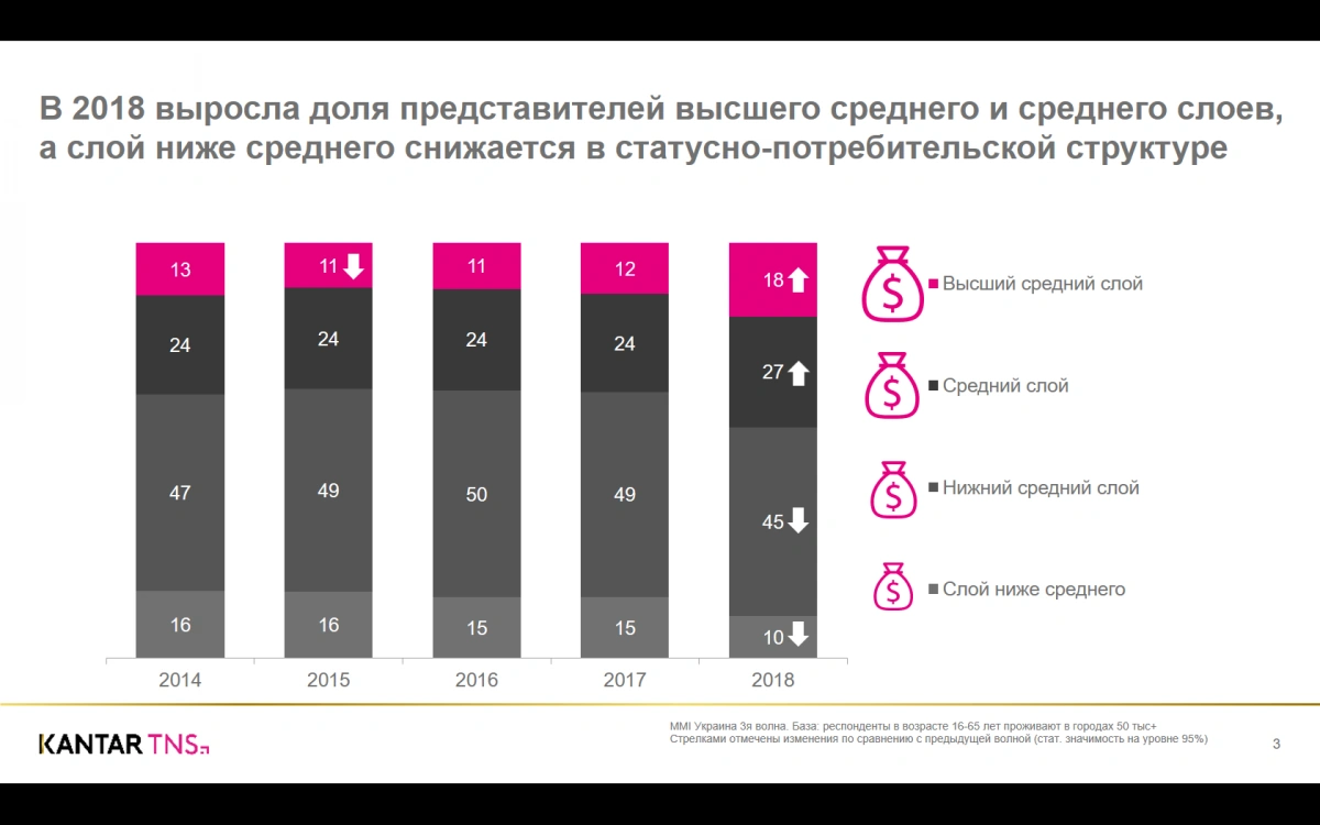 Мы привыкли оперировать постулатом, что в Украине нет среднего класса. Но в TNS его нашли. По ряду факторов и показателей, и он, конечно, сильно отличается от среднего класса в Европе, но он существует, и что интересно, потребительские настроения в этом сегменте совсем не такие, а в общей массе украинцев.