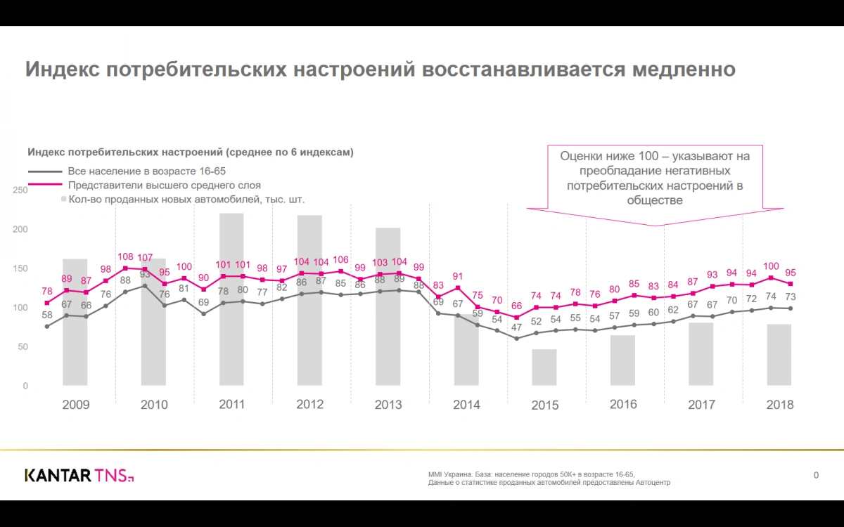 Если брать все население страны в возрасте от 16 до 65 лет, то индекс потребительских настроений в 2018 году составит 74-73, это тоже небольшой рост, но сам показатель низковат. А вот в среднем классе тот же индекс на уровне 100-95, а 100 в этом исчислении – магическая цифра, именно ее принято считать основной положительной динамики, то есть именно с сотни люди начинают считать себя счастливыми и с надеждой смотрят в будущее.