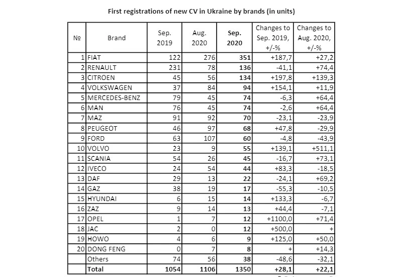 Всего с января по сентябрь 2020 года украинский парк грузовиков пополнился на 7,7 тыс. новых автомобилей, что почти на 12% меньше, чем за 9 месяцев 2019-го.