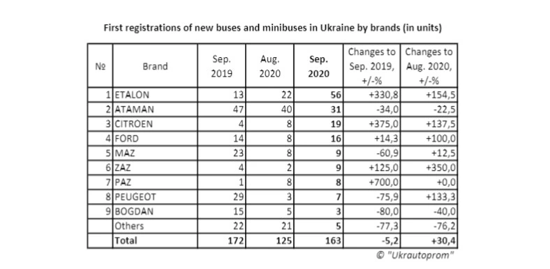 Если говорить о рынке новых автобусов, то в сентябре безоговорочным лидером стал «Эталон» - 56 машин, что на целых 330% больше, чем год назад и на 154,5% превышает показатели августа. Существенно отстает от него черкасский ATAMAN – 31 автобус (- 34% и – 22% соответственно). Третью позицию занимает Citroen – 19 машин (+375% к прошлому году и 137,5% к августу). На четвертом месте Ford – 16 ед., что на 14,3% больше, чем год назад, и на внушительные 100% превышает результат августа.