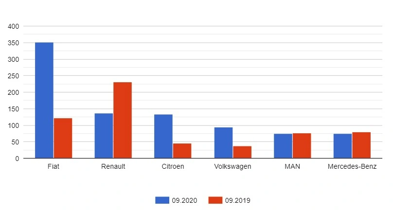 Четвертую позицию в статистике занимает Volkswagen – 94, что разительно отличается с сентябрем 2019-го (37 ед.) и на 10 ед. превышает итоги августа. Пятерку лидеров замыкают машины сразу двух марок – с одинаковыми показателями в 74 автомобиля. Это MAN и Mercedes-Benz, которые в августе, что примечательно, также имели идентичные результаты продаж – по 45 ед. каждый. А вот по сравнению с сентябрем 2019-го MAN потерял только 2,6%, а Mercedes-Benz – уже 6,3%.