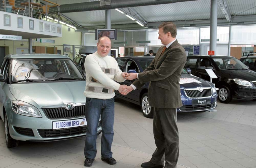 В автосалоне «1-й Автоцентр Skoda» состоялся финальный этап Всеукраинской акции «Автомобиль года в Украине 2011». Сергей Атаман, генеральный директор Медиагруппы «Автоцентр» – организатора Всеукраинской акции «Автомобиль года в Украине 2011» вручил самому везучему ее участнику ключи от новой стильной Skoda Fabia. Напоминаем, что этот автомобиль достался Руслану Миронюку из Киева. Как рассказал Руслан, голосуя за «Автомобиль года 2011», он даже не думал, что выиграет машину, хотел лишь высказать свое мнение о новых моделях. Звонок из студии Первого Автомобильного телеканала, в эфире которого проводился розыгрыш призов, застал его в самый разгар рабочего процесса, он даже не сразу понял, о чем речь. Осознание пришло позже, когда родственники и друзья, увидев сюжет по телевизору, стали «обрывать» телефон. «Выигрыш автомобиля – говорит Руслан, – продолжение белой полосы в моей жизни. У меня недавно родилась дочь, повезло с покупкой квартиры, а тут еще и машина! Может, мне стоит купить лотерейный билет? А остальным участникам акции, тем, которые остались без приза, скажу: голосуйте – и выигрывайте! Все было честно». Поздравляем Руслана! Ни гвоздя, ни жезла на новенькой Fabia! Остальным читателям напоминаем, что испытать Фортуну снова они смогут через год – во время следующей Всеукраинской акции «Автомобиль года в Украине».
