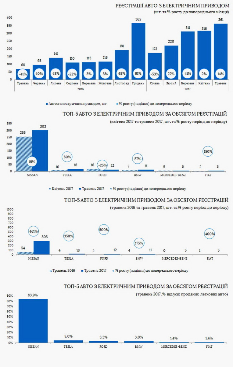 У трійці лідерів продажу електромобілів за січень-травень 2017 року перебувають машини Nissan – 1158 шт. (частка 83,9%), за ними йдуть машини Ford – 62 шт. (частка – 4,5%) і Tesla – 49 од. (частка 3,5%).
