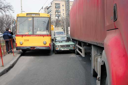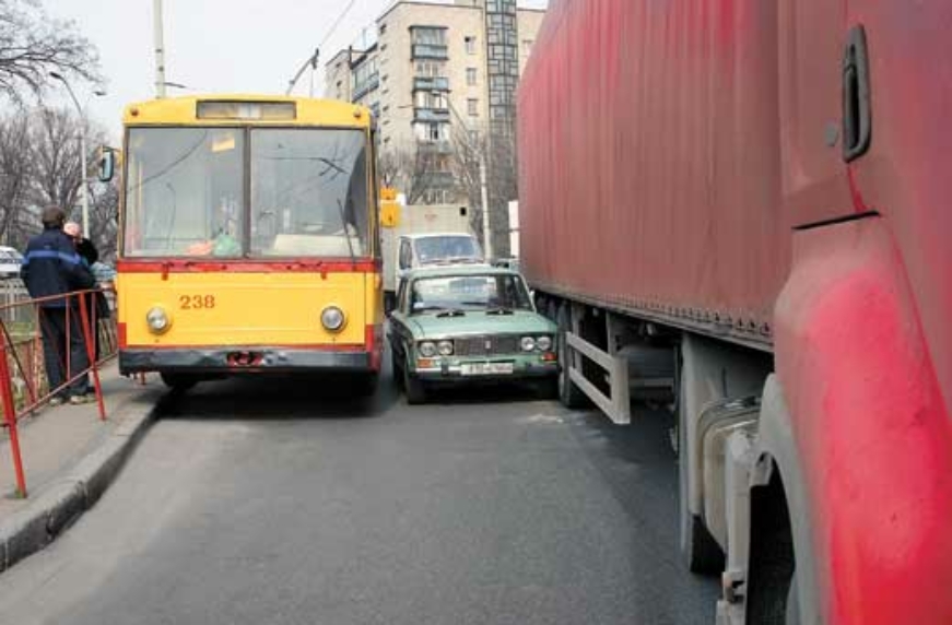Во втором ряду грузовикам мешают маршрутные автобусы и такси, поэтому фуры вынуждены выезжать в крайний левый ряд. Повернуть направо из крайнего правого ряда грузовики с прицепами не могут. Ведь у большинства современных автопоездов наименьший наружный радиус поворота составляет около 12,5 м, а внутренний – 5,3 м, следовательно, для такого маневра требуется полоса шириной около 7 м (а это практически две полосы движения). Встретив препятствие на своей полосе, грузовик вынужден начинать объезд заблаговременно и из-за большой ширины габаритного коридора частично выезжает на встречную полосу или в третий ряд.