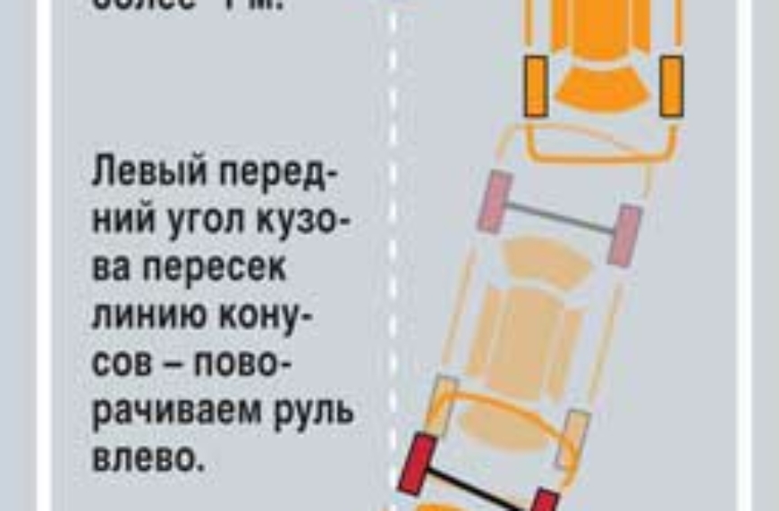 Самое главное в данной «дисциплине» – поворачивать руль в нужный момент времени. Практически вне зависимости от типа автомобиля главным «подсказчиком» водителю будет служить сам автомобиль – передние углы его кузова и центр передних дверей.