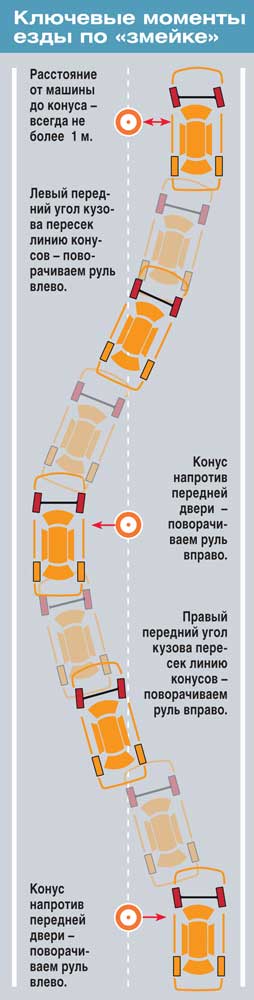 Важный момент – скорость движения. Если спешить вам некуда, то чем ниже она, тем безопаснее будет совершаемый маневр. Но совета преодолевать «змейку» с периодически выжимаемым сцеплением (для снижения скорости) мы не даем – это уж для полных «чайников». Человеку с некупленными правами доступно начинать езду по «змейке» на первой передаче (режим D у машин с АКП) с отпущенным акселератором. Обеспеченная этим небольшая и равномерная скорость облегчит обучение. Когда овладеете азами и начнете тренироваться «на скорость», имейте в виду: сброшенный при входе в поворот газ сделает управляемые колеса более цепкими, а при выходе из поворота (выравнивании руля) самое время «поддать газку».