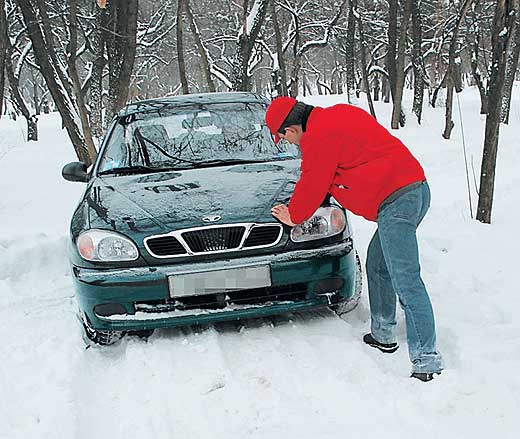 Увлекшись борьбой со стихией, мы решили опробовать и самый экстремальный способ. Правда, он подойдет только для автомобилей с ручным управлением воздушной заслонкой карбюратора (подсосом) и с инжектором, если он обеспечивает стабильную тягу на холостом ходу. При отсутствии помощников водитель может сам подталкивать свою машину. Убедившись в хорошей спортивной форме сидящего за рулем и посоветовав ему крепче держаться за рамку двери, коллеги отошли в сторону.