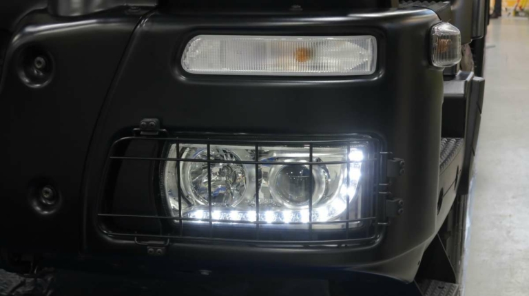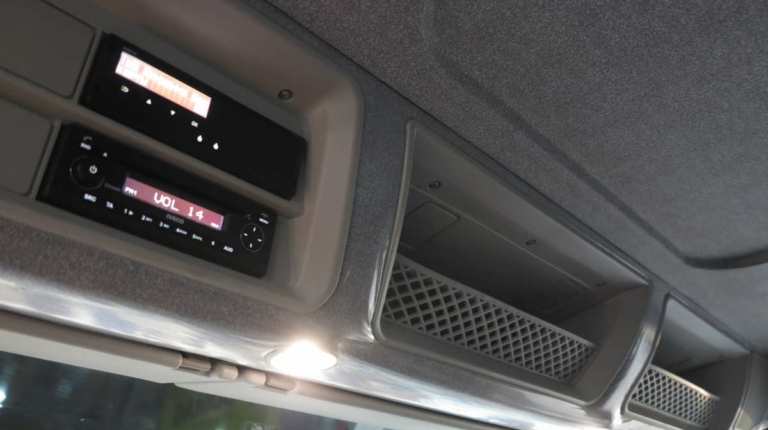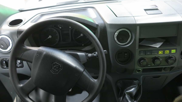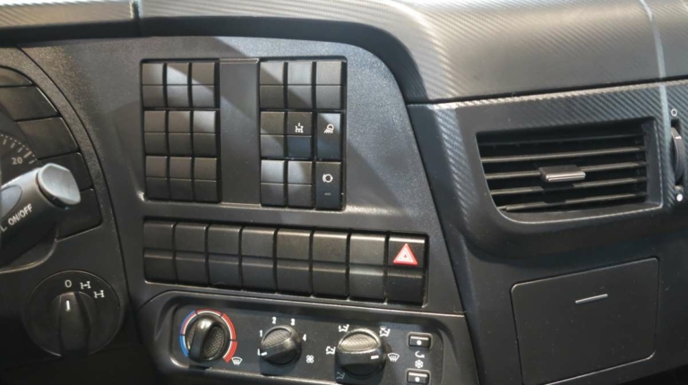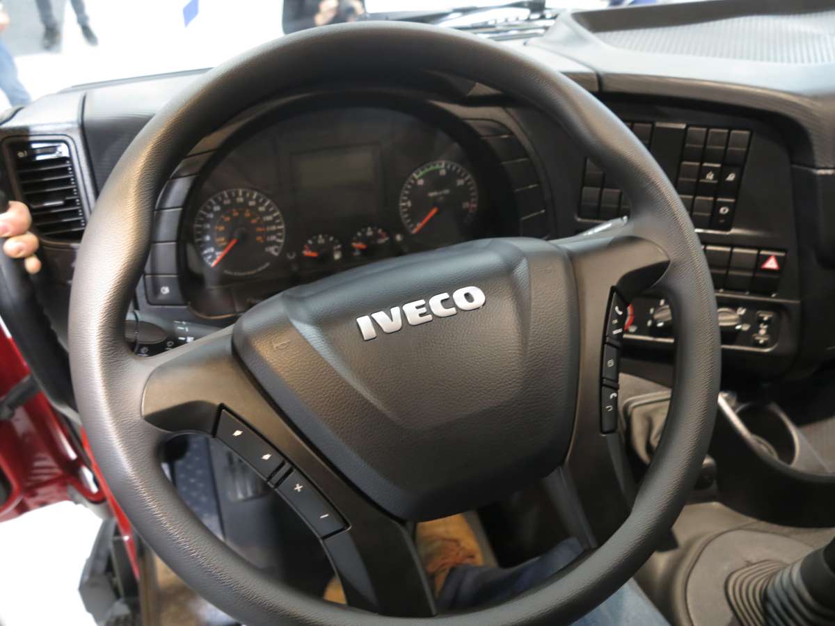 Показанная машина укомплектована LED-ходовыми огнями, которые идут в паре с фарами-линзами. Светоблоки спереди и сзади защищены решетками. Машина оснащена дневной или спальной кабинами, размер кузова при этом одинаковый, так как применяется различная колесная база – 4250 и 4750 мм соответственно. Цена представленного самосвала на выставке – 120 тыс. евро.